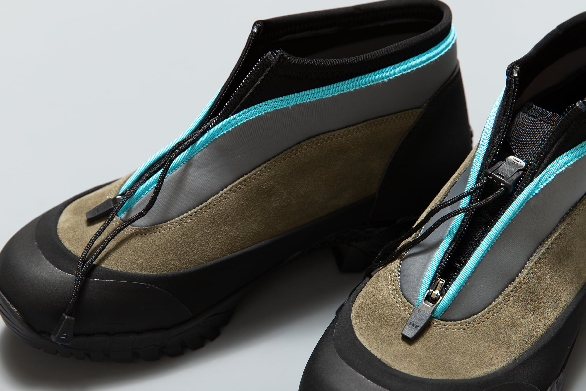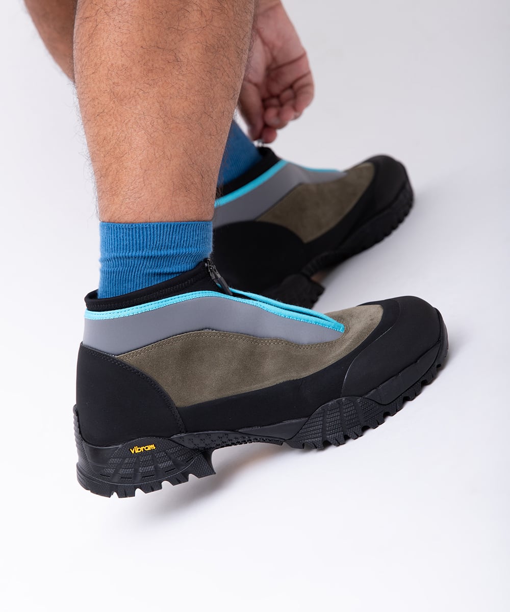 CAVEの新型の登場です。前作は使用したvibram®ソールのサイズ展開の都合上、41サイズより小さいサイズが作れませんでした。女性からのリクエストも多かったこともあり、38サイズから展開可能で、CAVEにマッチするソールを選び新しいCAVEが生まれました。このソールに変えたことにより、ボリューミーな前作よりシャープでより大人っぽいエレガントな雰囲気を醸し出しています。つま先からラバー、レザー(牛革)、ネオプレーンのレイヤーで構成されたアウターとナイロンのインナーの2層構造のシューズです。インナーにはクイックシューレースシステムを初めて採用しました。シューレースを結ぶこと無くアジャスターで簡単にホールド、リリースができます。ソールはおなじみvibram®のライトトレック用のソールを使用しています。濡れた路面でも滑らず優れた防滑性を兼ね揃えています。前作同様、街から野山までアクティブに履いて欲しいシューズです。こちらのカラーはPLAYGROUND限定カラーです。