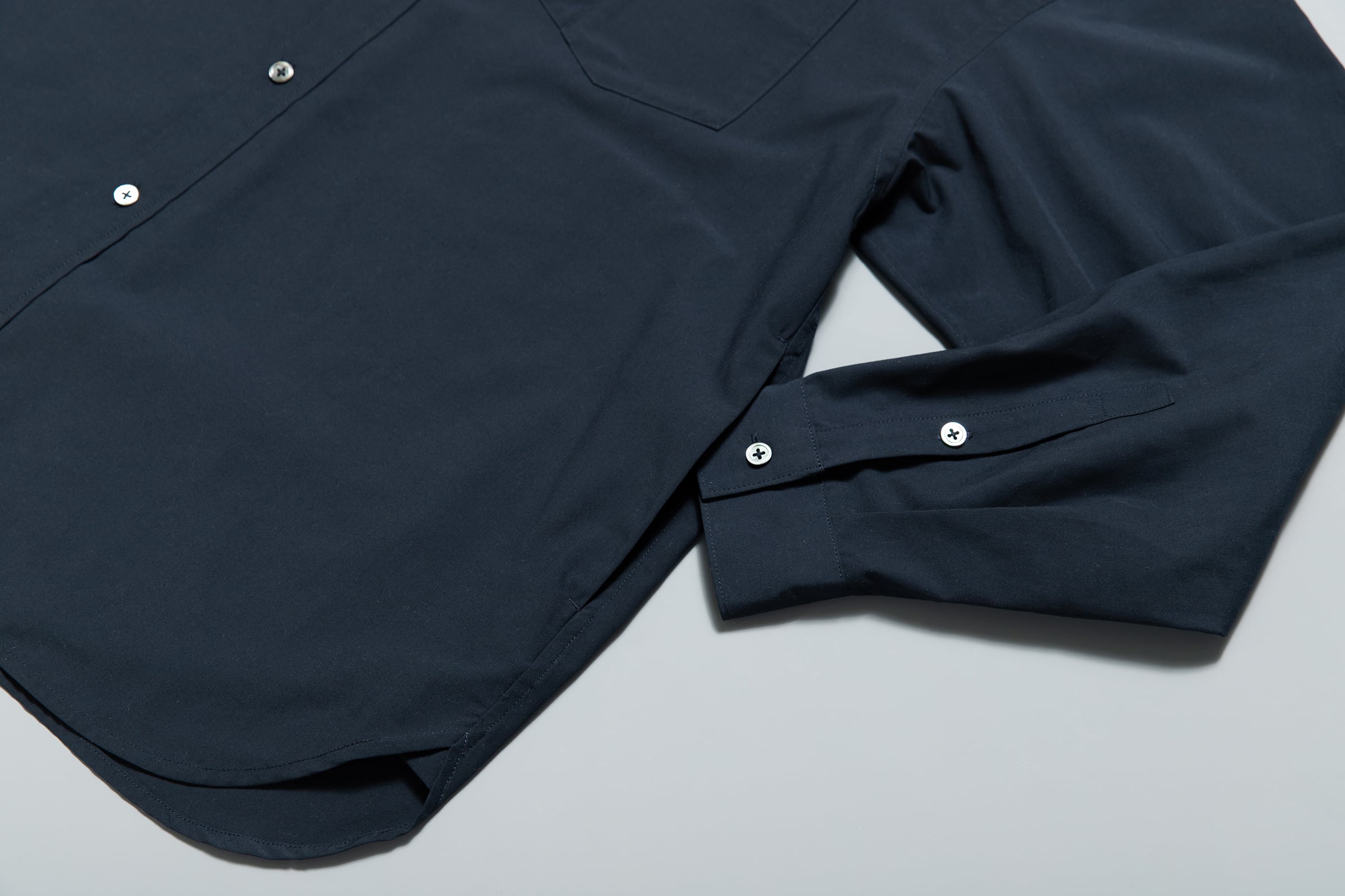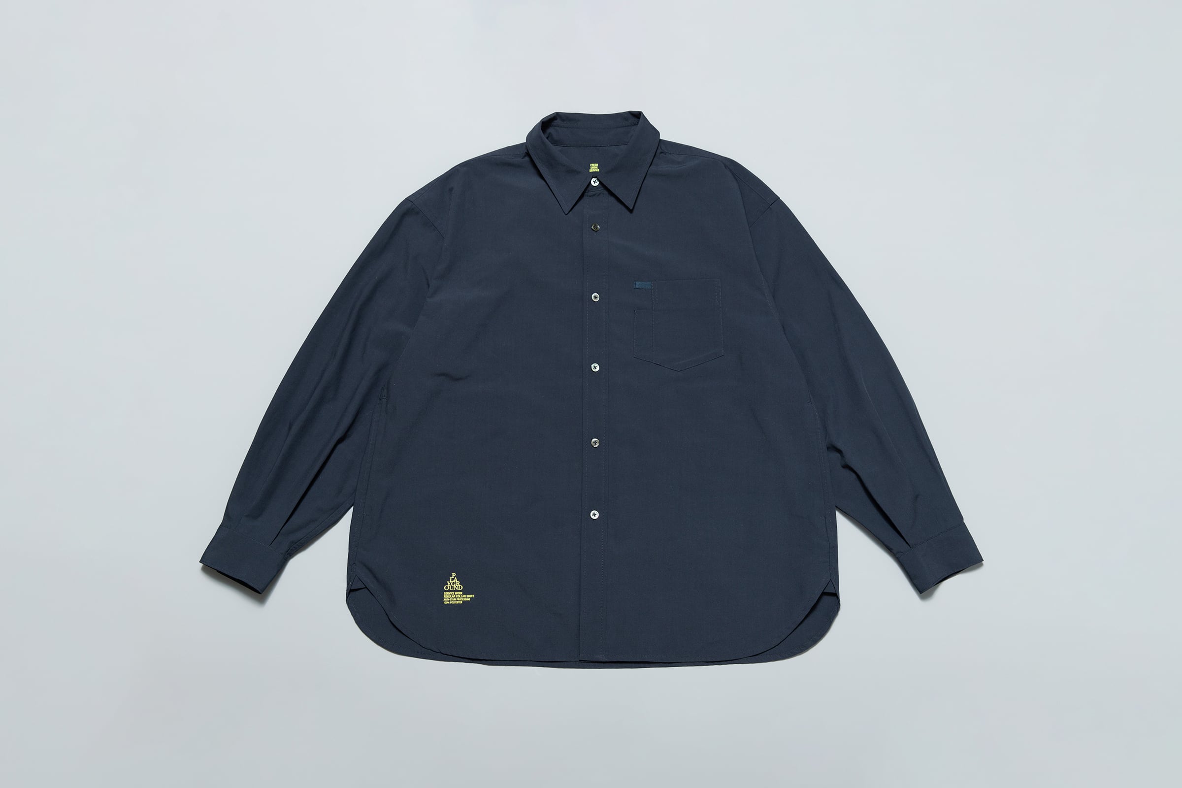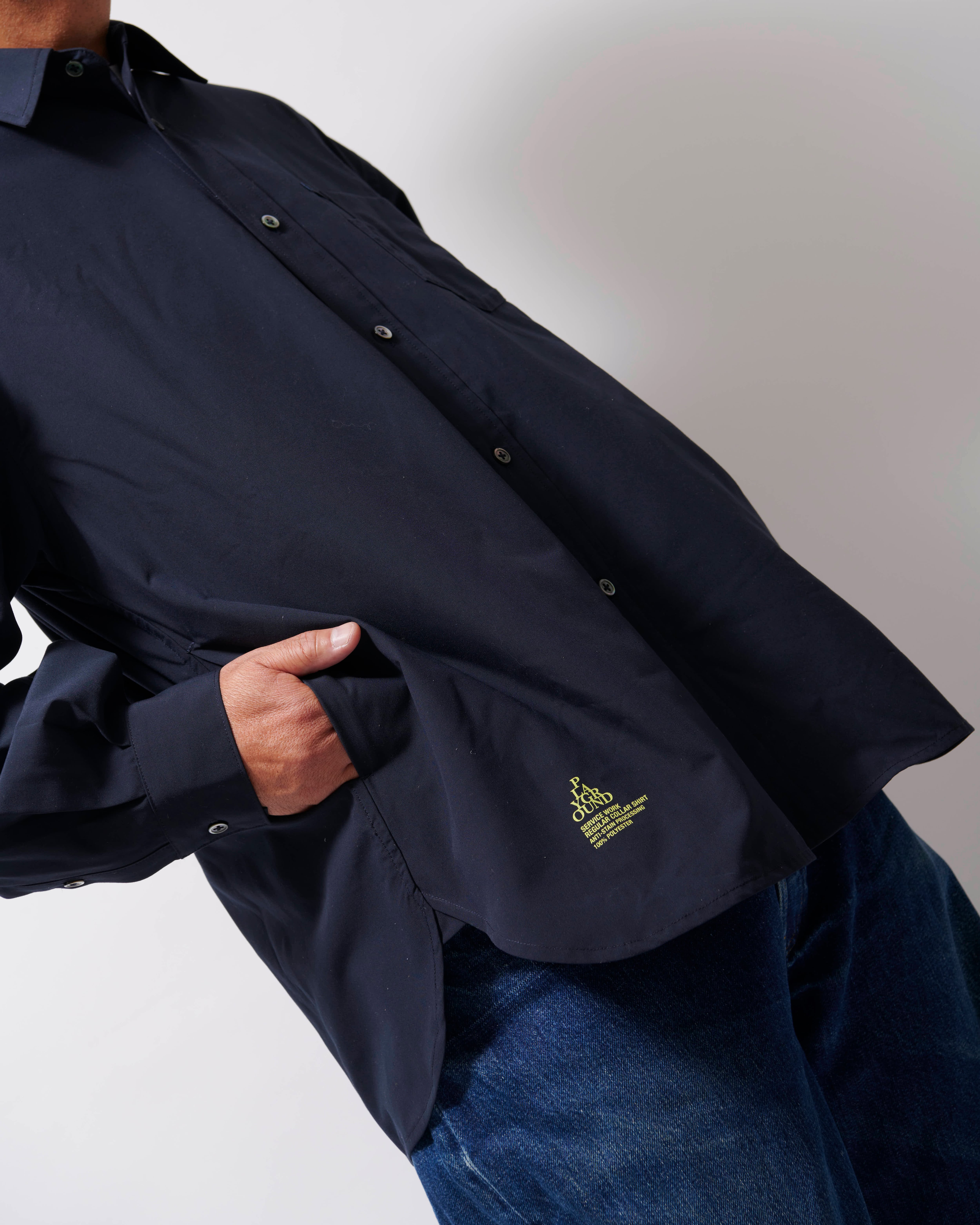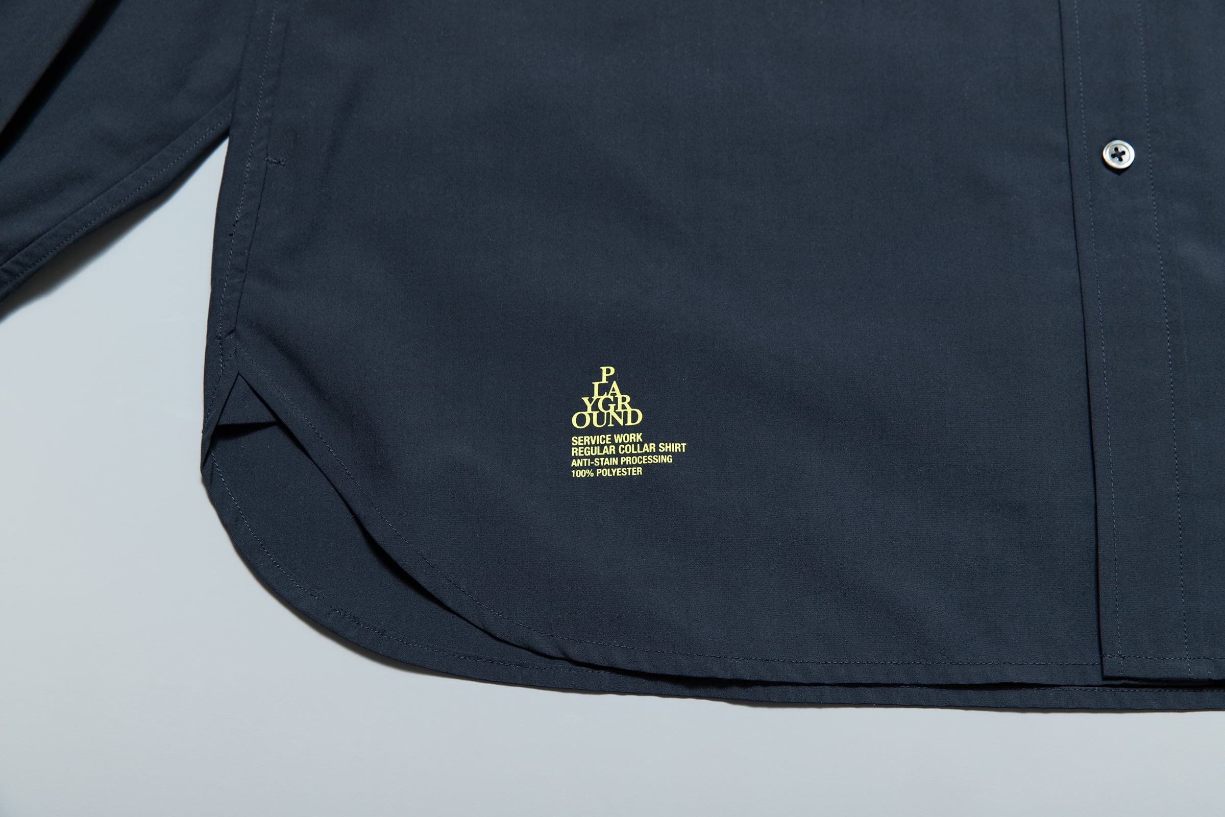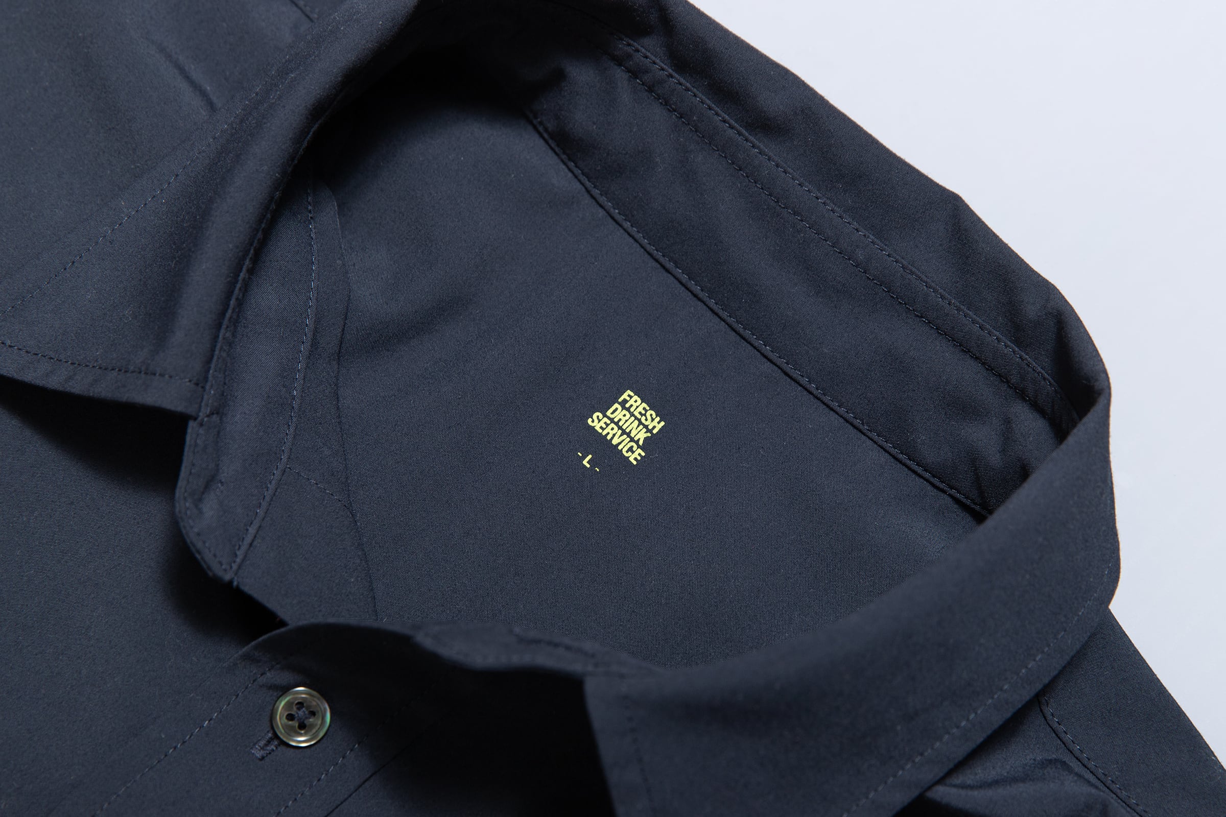 This is one of our 7th anniversary items. We at PLAYGROUND are a sneaker shop. When we decided to offer shirts, we thought about what kind of shirt would be best. High-quality, well-tailored shirts made from high-grade fabric are nice, but we wanted a shirt that could be worn while actively enjoying festivals, camping, and skateboarding, and that could be worn toughly without worrying about getting dirty or falling down. That's when we came across this shirt. It is a uniform shirt from FreshService's “FRESH DRINK SERVICE” category, designed for use in restaurants and service industries. The fabric is a lightweight polyester plain weave, featuring a soft, cotton-like brushed finish and a matte texture. It combines quick-drying and water-repellent properties, making it resistant to water and stains while also being wrinkle-resistant. Despite these practical features, it still exudes a sophisticated and elegant vibe. We had this shirt made in a color scheme inspired by the iconic “navy and yellow” color combination of sneakers. It's a shirt we want you to wear both for work and play, no matter how active you are.