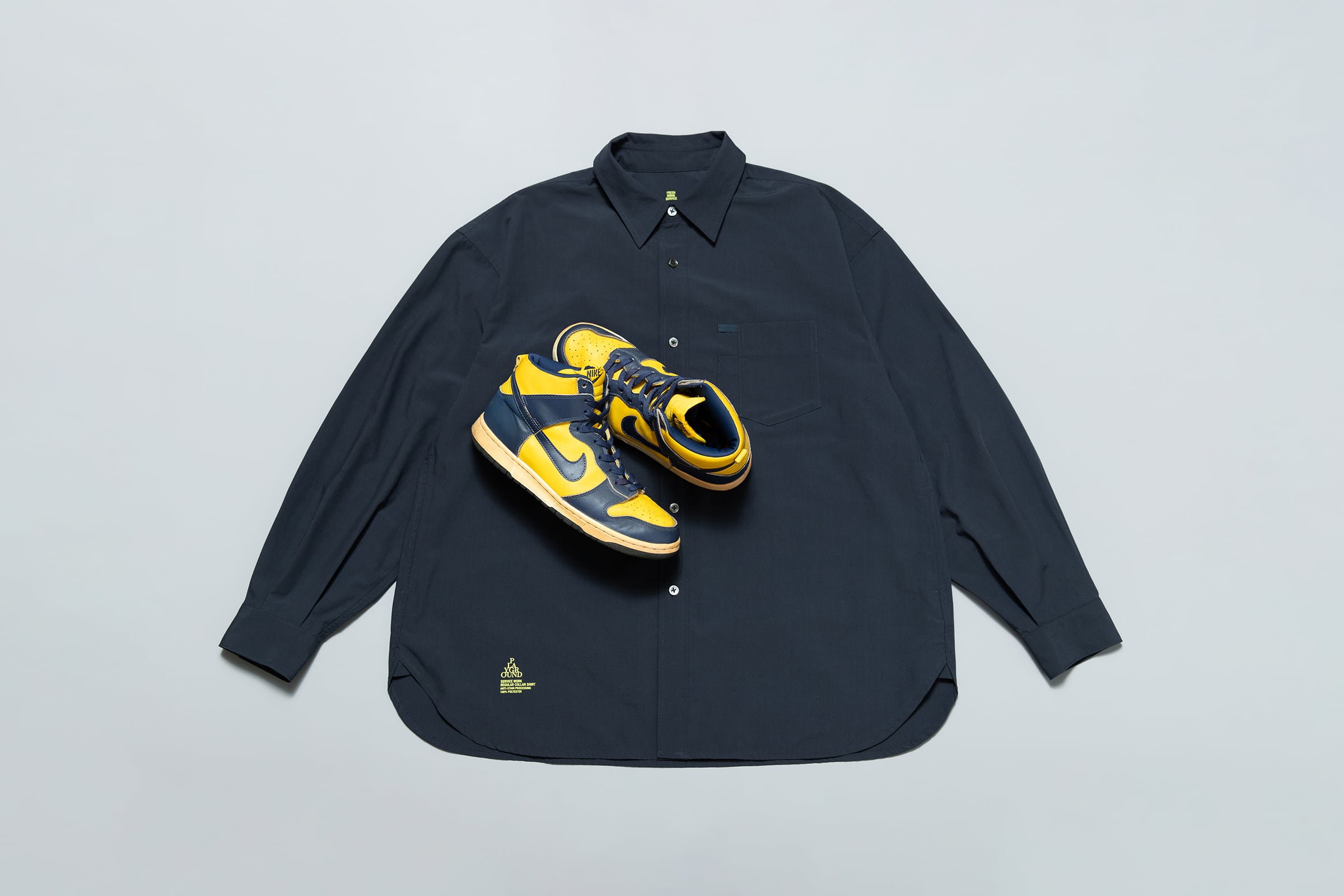 7周年記念アイテムの1つです。我々PLAYGROUNDはスニーカーショップです。そんな我々がシャツを提案する際、どんなシャツがベストなのかと考えていました。高番手の上質な生地で仕立ての良いシャツも良いですが、アクティブにフェスやキャンプ、スケボーを楽しむ時にも着れるシャツ、多少汚れても転んでも気兼ねなくタフに着れるようなシャツが良いと考えました。そんな中に出会ったシャツがこちらです。FreshServiceの「FRESH DRINK SERVICE」という、飲食店やサービス業の現場で使われることを想定したカテゴリーからのユニフォームシャツです。素材は軽量のポリエステル平織り生地を使用。コットンのような柔らかいブラッシュ仕上げとマットな質感が特徴です。速乾性と撥水性を兼ね備えており、水や汚れにも強く、シワがつきにくい特徴があります。それでいて、きちんと上品な雰囲気も醸し出している流石な一着です。そんな最高のシャツをNAVYxYELLOWいわゆる「紺黄」というアイコニックなスニーカーの配色をイメージしたカラーリングで作ってもらいました。仕事も遊びもアクティブに着て欲しいシャツです。