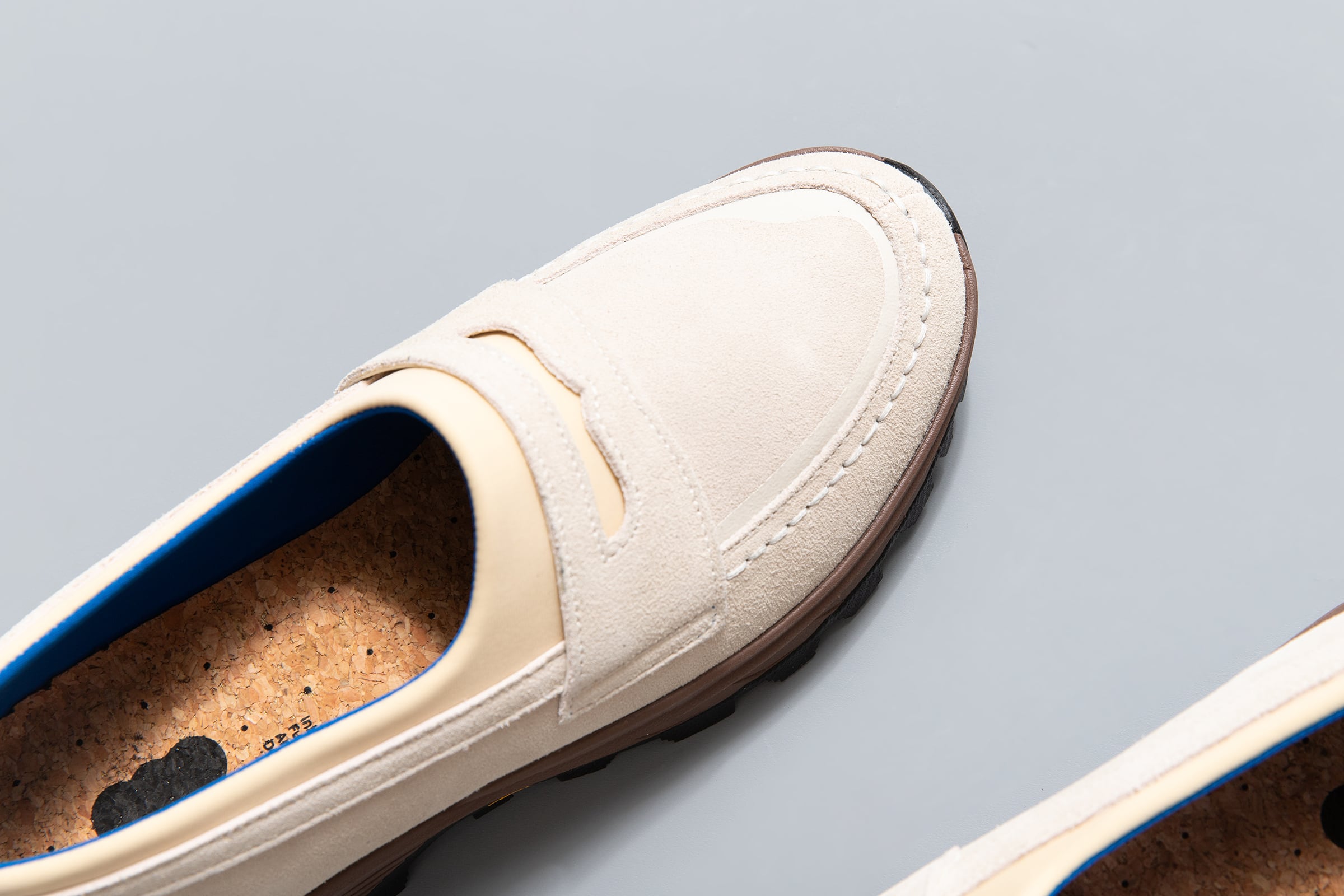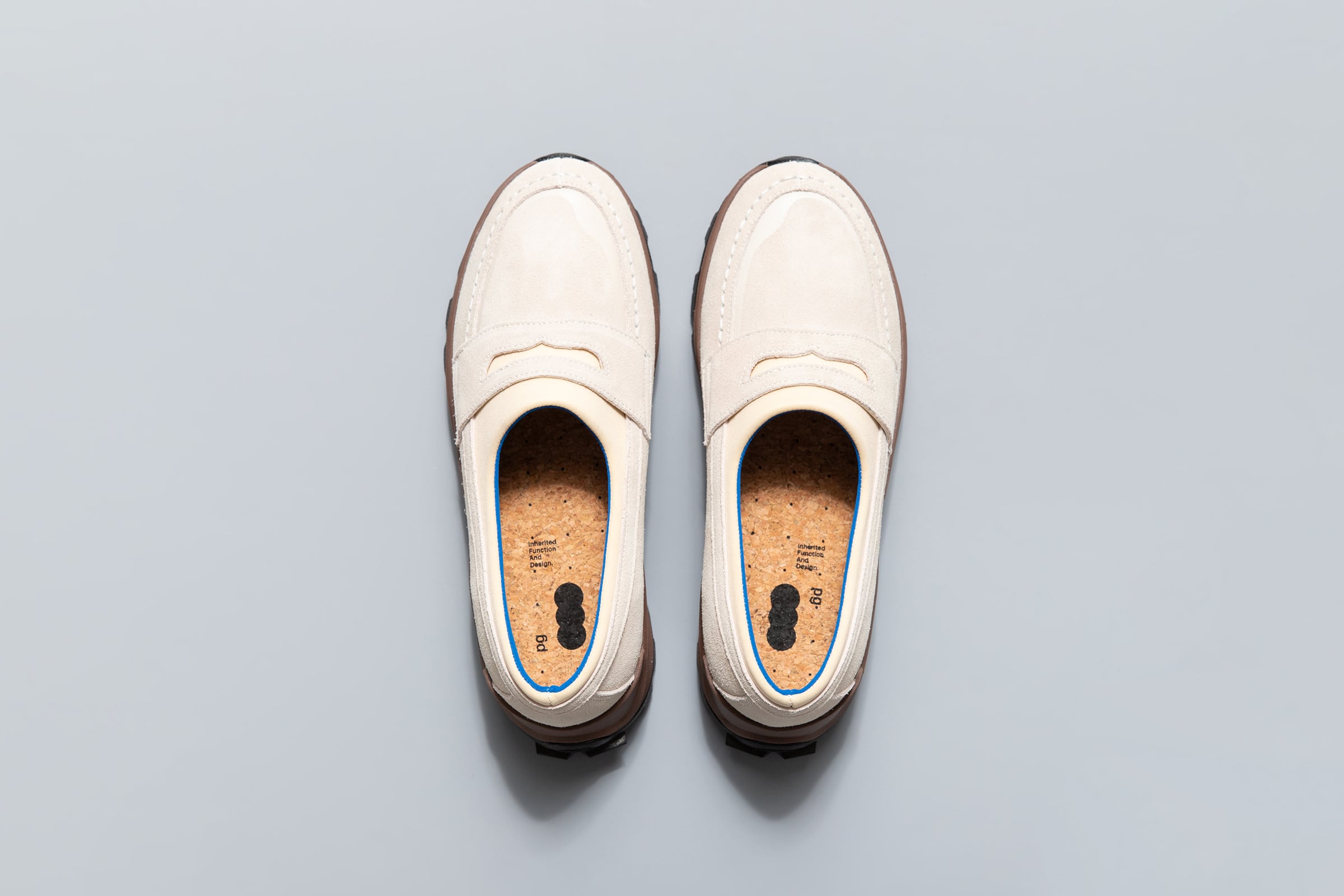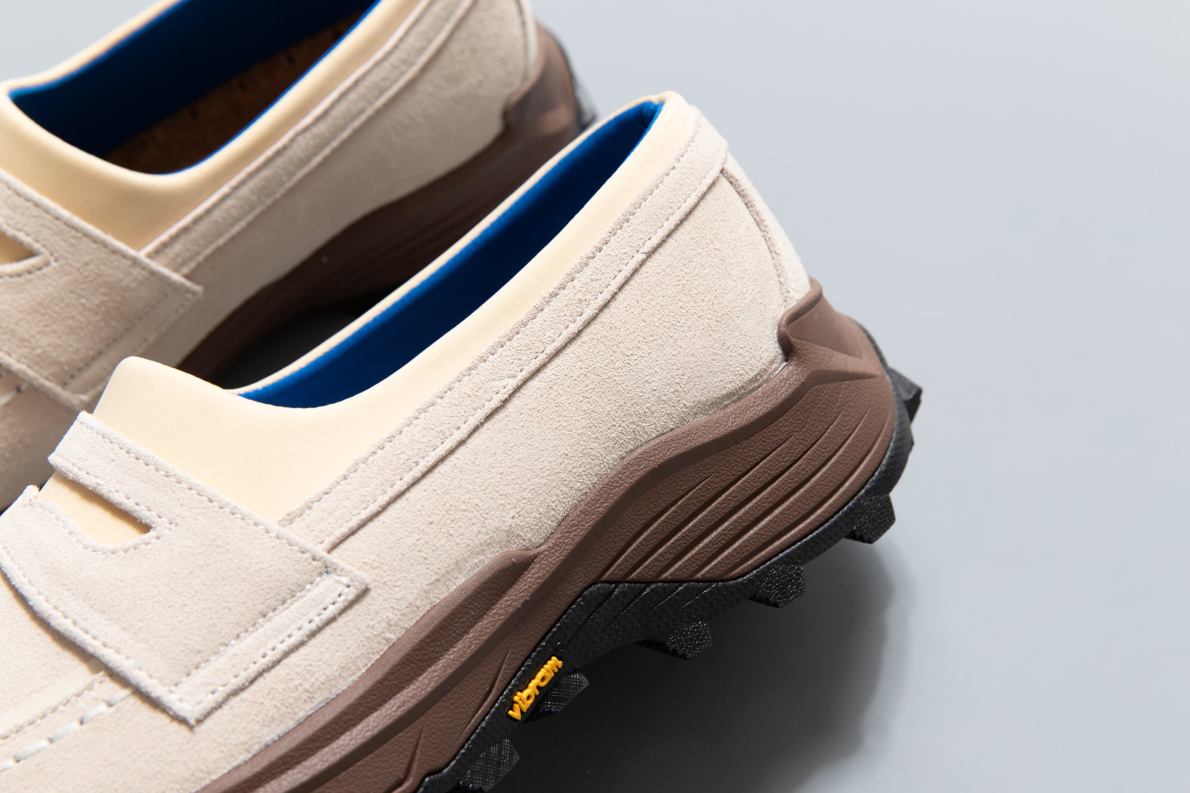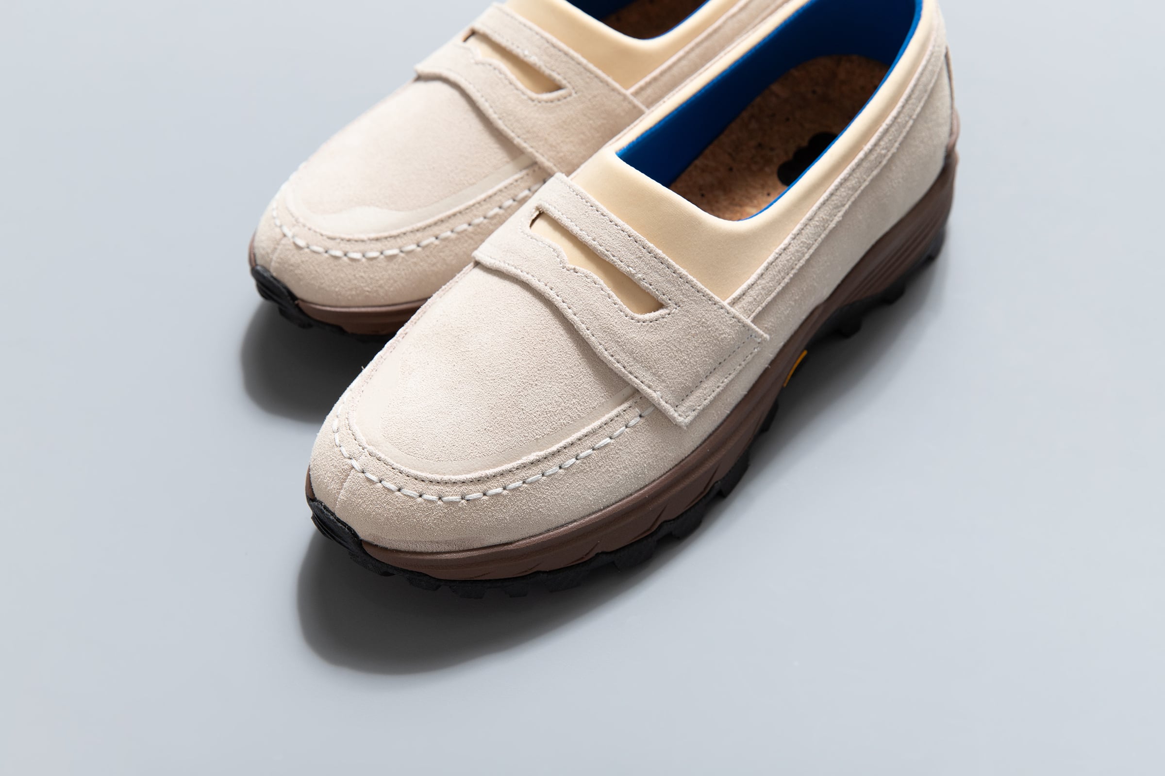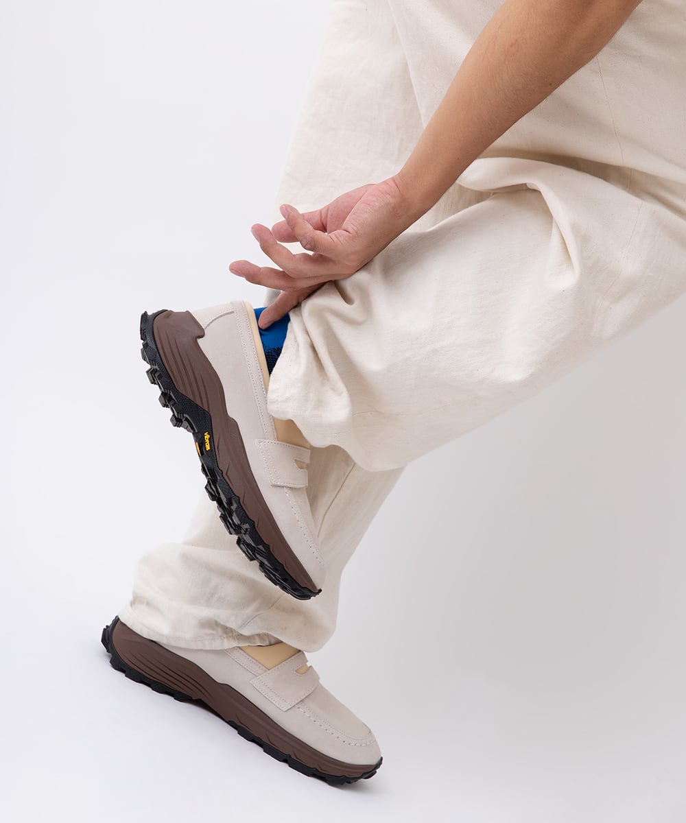 新しく生まれ変わったDISHの登場です。GAEDEN MOCやTRAIL MOCのようにスリッポンで履ける、モックタイプのシューズの延長線として考案しました。ただ、従来のアクティブなアウトドアテイストのものではなく、コンサバティブで少しドレッシーなローファータイプのアッパーに仕上げました。ソールはvibram®のライトトレック用のソールを使用しています。アッパーとソールのミスマッチを狙った1足です。オンでもオフでも活躍する、新しいDISHです。