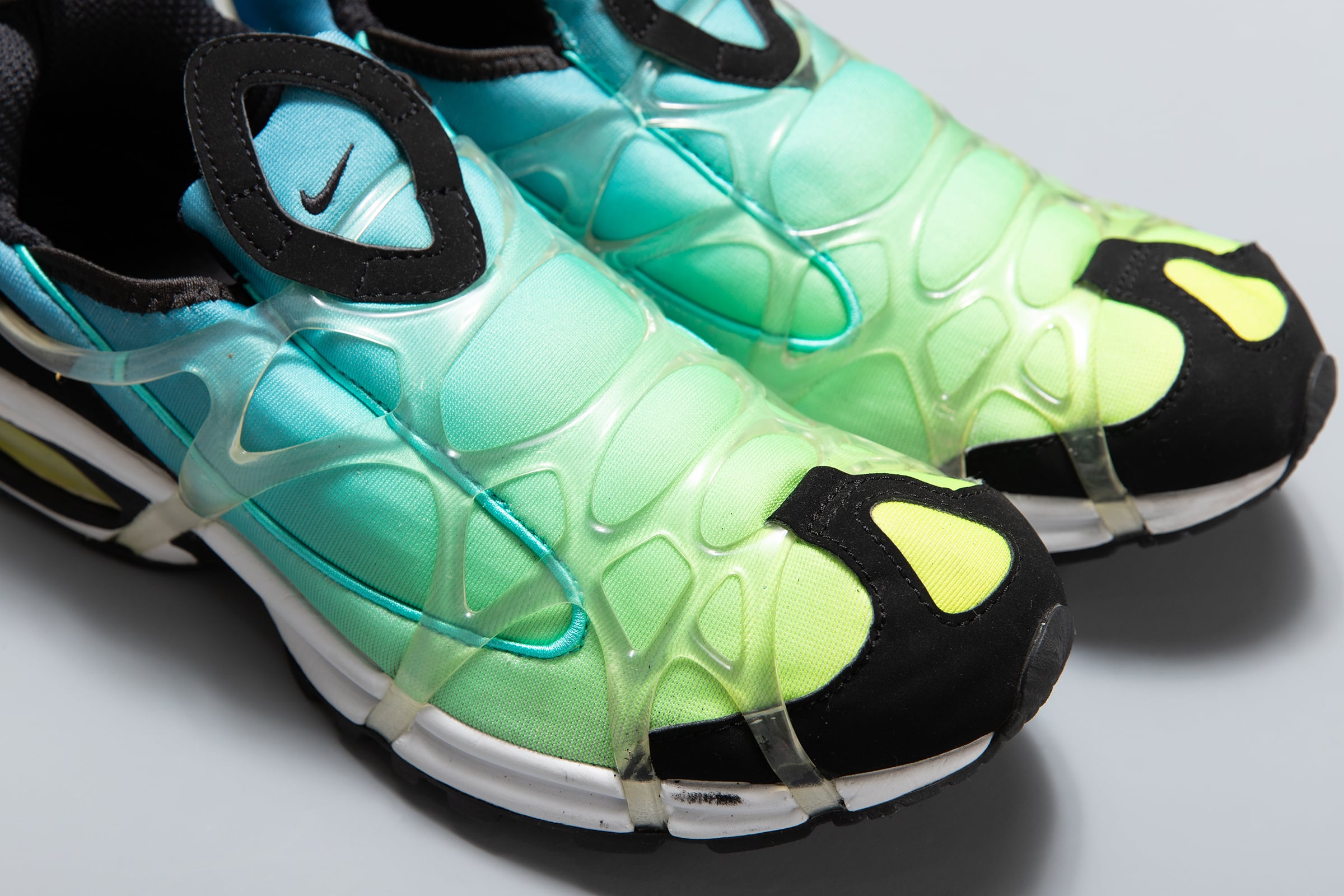 NIKE ALPHA PROJECTからの一足。"AIR KUKINI"のオリジナルは2000年に発売され、特異なデザインとその独特なフィッティングで注目を浴びたランニングシューズです。カラーリングも魅力的。特に暑い時期はは服装がシンプルになりがちかと思います。そんな時の足元にぜひ。デニムやショーツとの相性が良さそうです。2021年製。若干の使用感はありますが、年代が浅い分まだまだ履いていただける一足です。