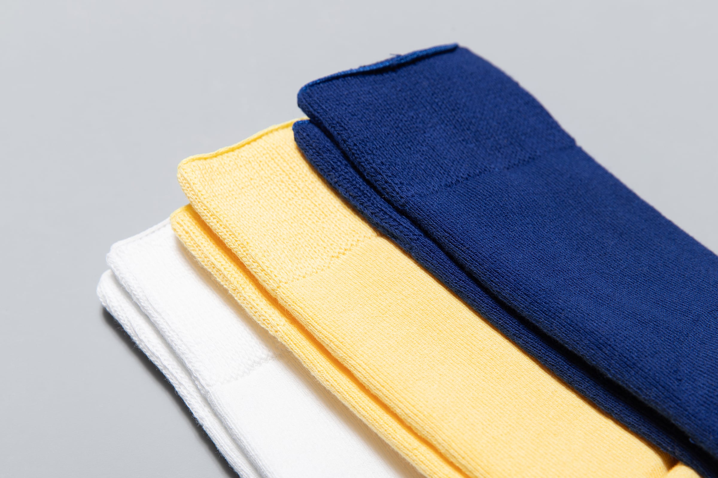 Tabi socks with split toe in two. Three-pack socks for change of wear with a soft wrap-around and absorbent feel. The cotton base is blended with a special German-born fiber that exhibits high sweat absorbency, resulting in a resilient texture. The back side has a comfortable pile specification all over, and a single rib made with a special knitting machine is used for the opening. The backside has a comfortable all-over pile specification, and the opening is a single rib made with a special knitting machine. The anti-bacterial and deodorant treatment keeps the garment clean and comfortable.
