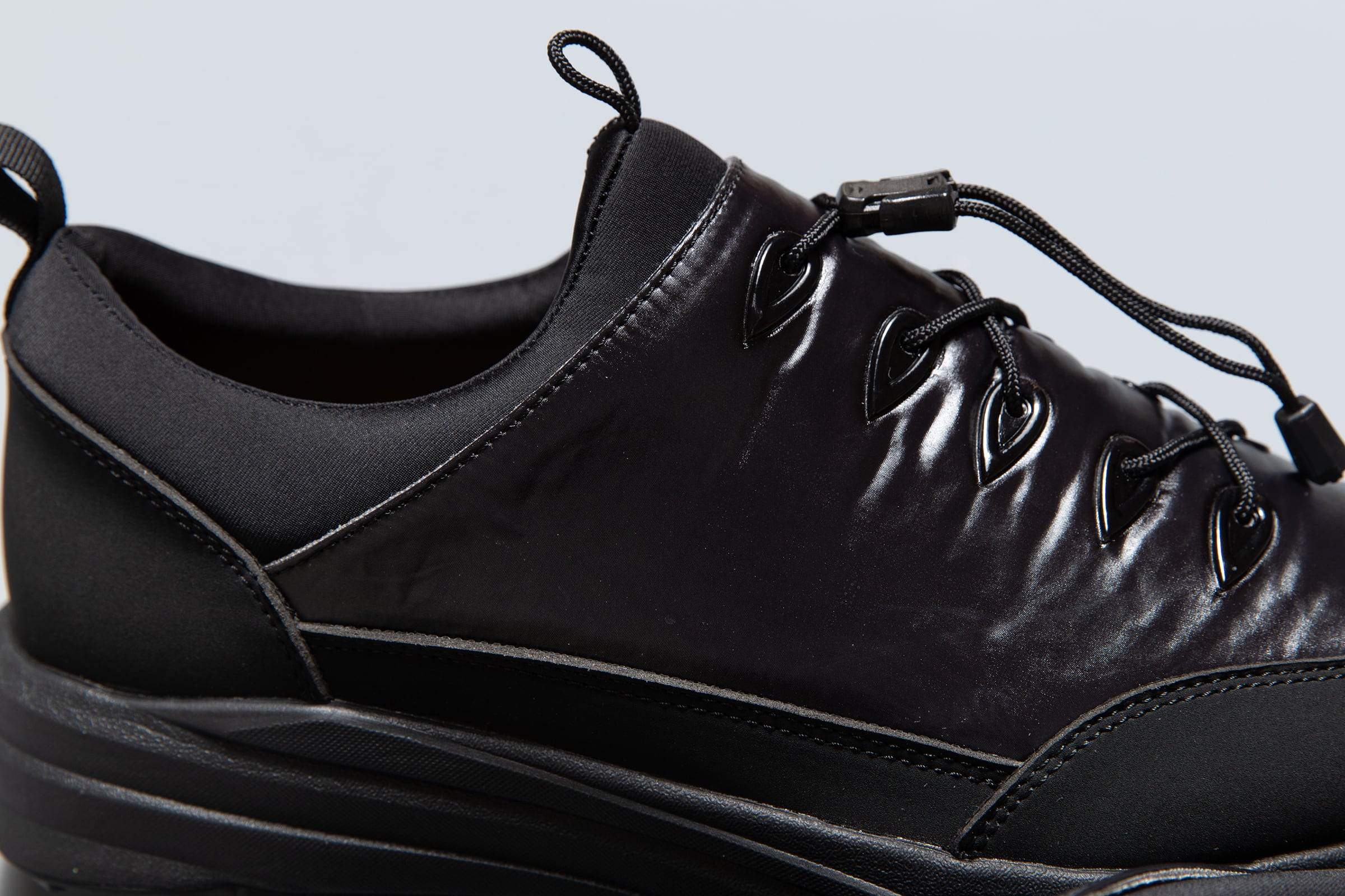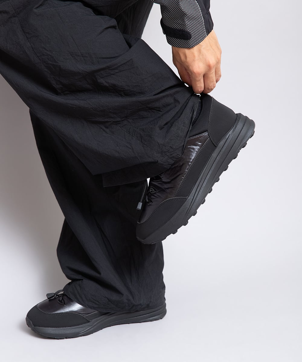 This is the new DRIP model. The upper has a two-layer structure. The inner layer is equipped with a thick neoprene sock liner. Thanks to its elasticity, this sock liner alone provides a comfortable fit. DRIP is an autumn/winter product, so it was designed with down jackets in mind. The outer layer is made of glossy polyester, and when the shoelaces are tightened, it wrinkles to create a down jacket-like appearance. For reinforcement, a waterproof and breathable KING TEX layer is added to the back, ensuring high waterproof performance. Additionally, the droplet-shaped eyelets, inspired by the DRIP name, are constructed using gel printing. The shoelaces utilize a quick-lacing system. The sole uses a lightweight, soft trail running sole from vibram®, offering exceptional comfort.