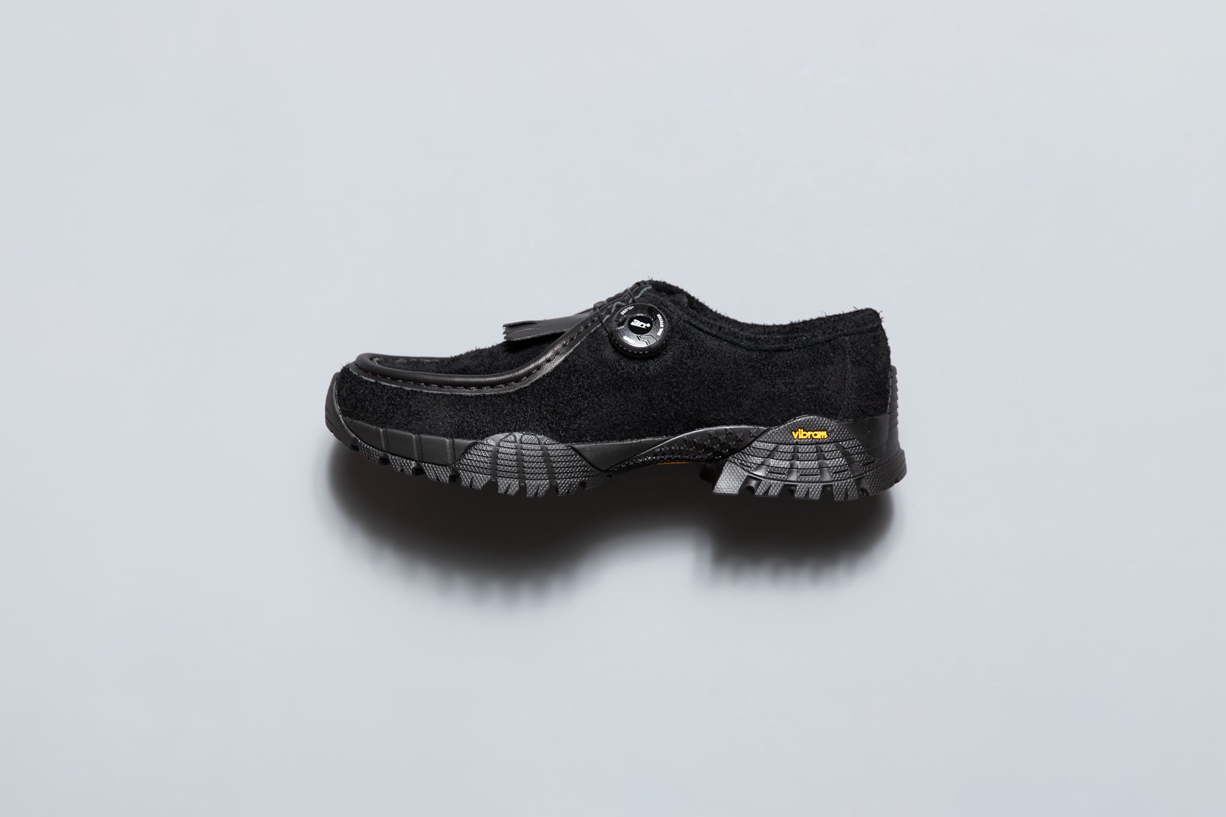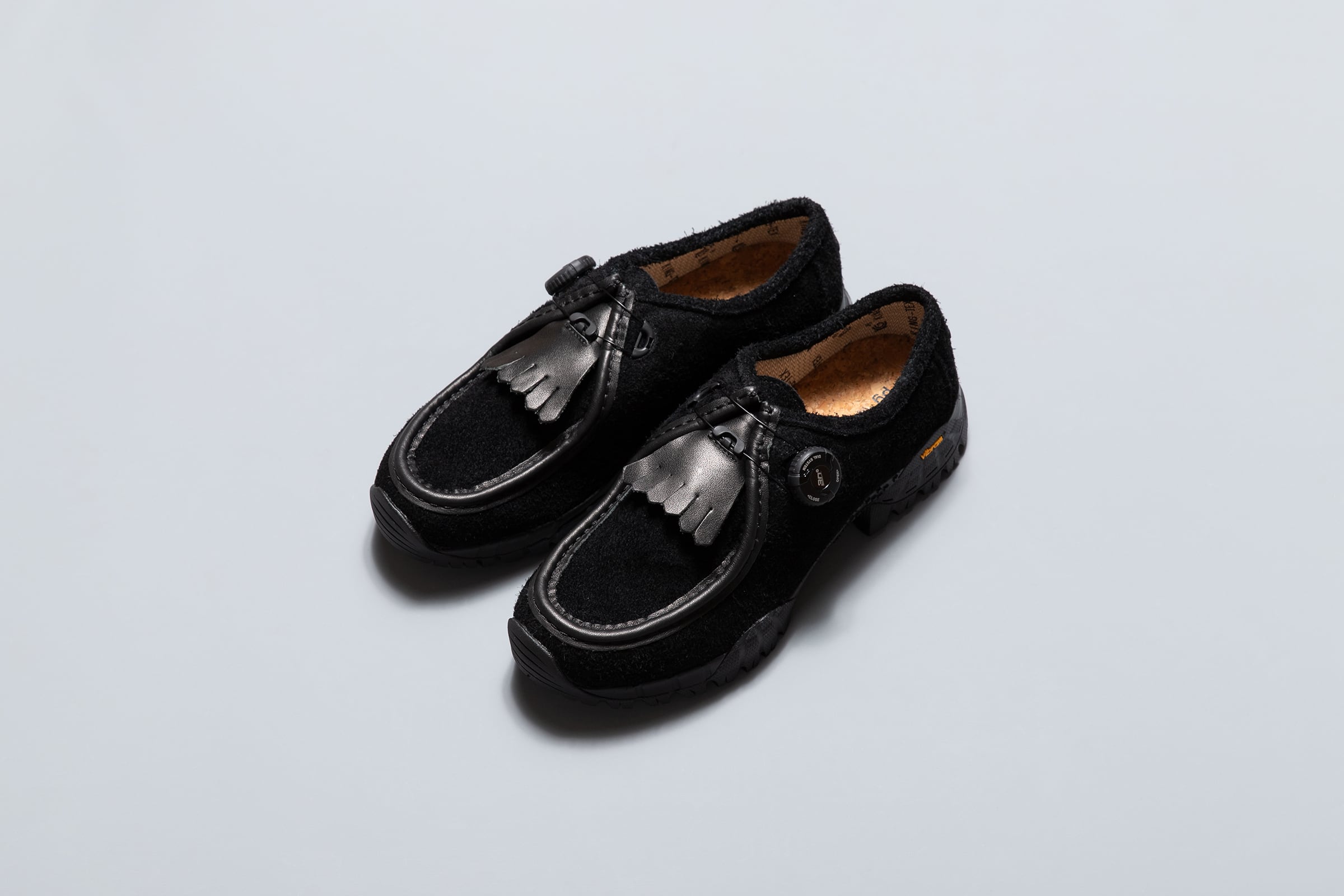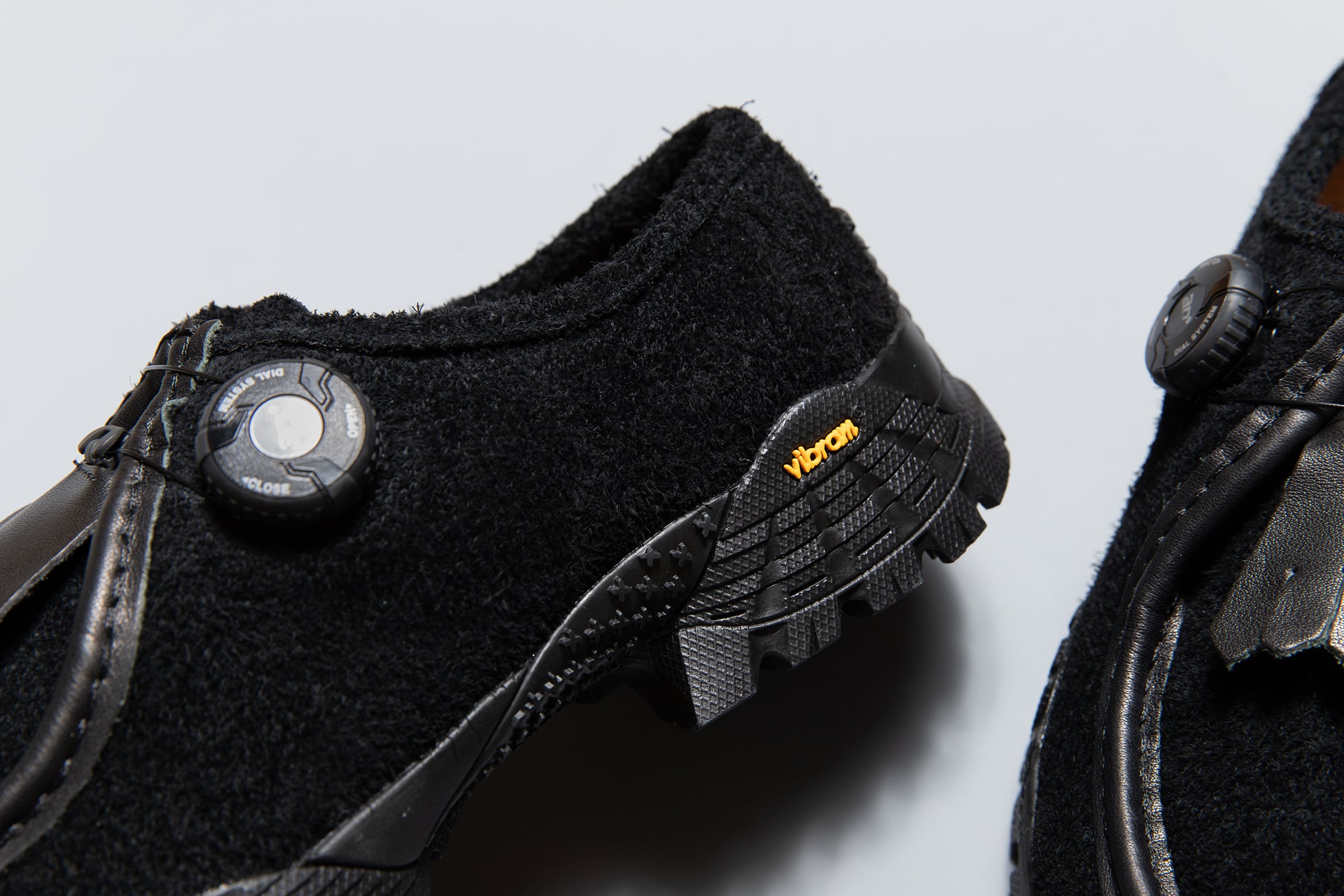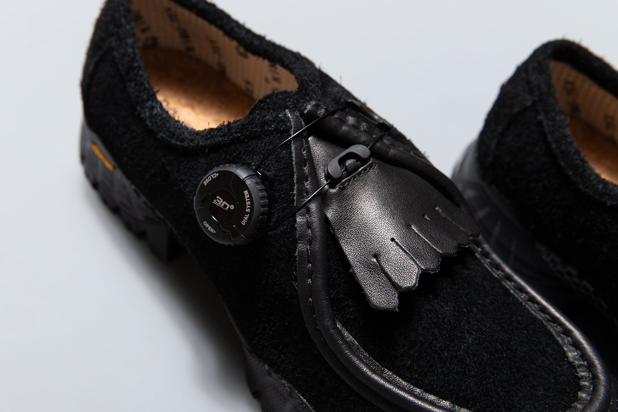 Introducing a special edition of KNOCK. The upper features long-pile black cow suede. Against the rugged suede, smooth leather piping and quilted panels create a striking contrast for this special pair. We've crafted a distinct atmosphere, different from the usual KNOCK. This model also features the waterproof and breathable KING-TEX membrane as its liner. It offers enhanced waterproofing and breathability, effectively releasing moisture from inside the shoe. Equipped with Vibram® soles for trail running and retaining the FREELOCK system, it achieves a classic feel while being finished as a stylish, modern shoe. We've also focused on making it an affordable price point.