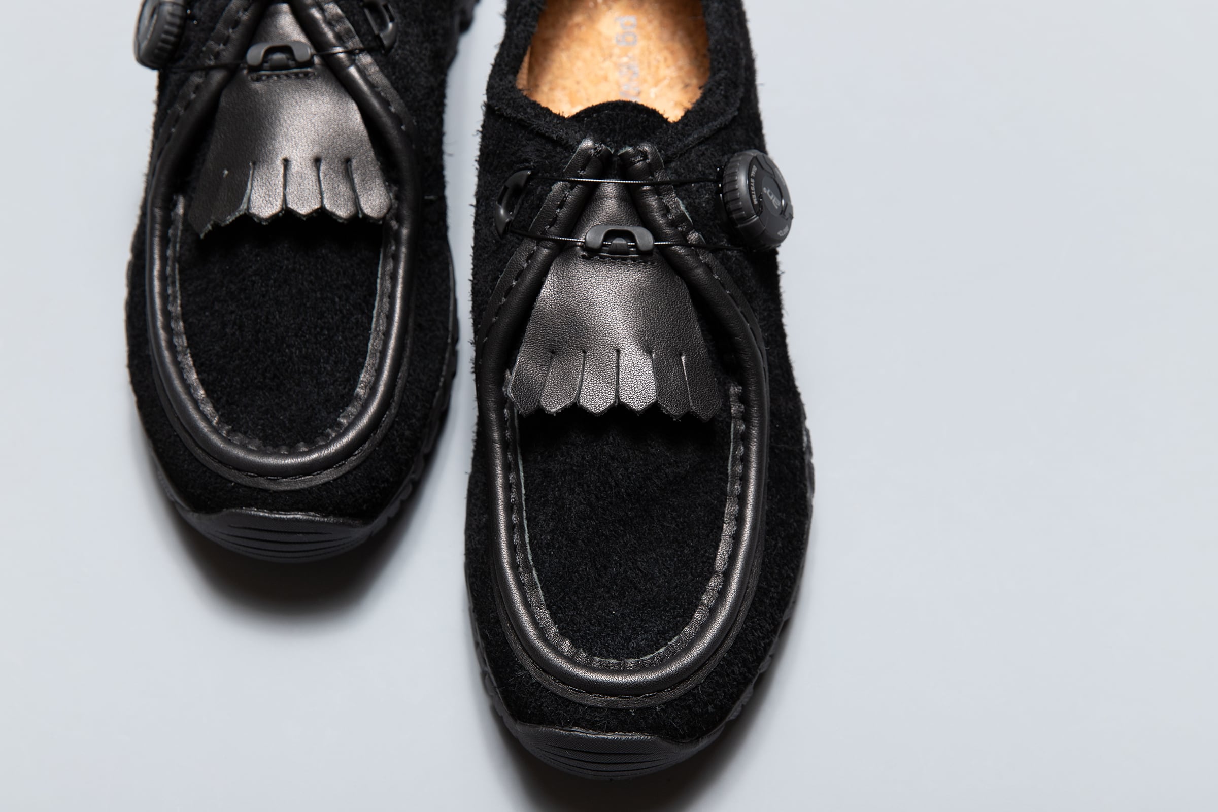 KNOCKの特別仕様の登場です。アッパー本体は毛足が長いブラックのカウ・スエードです。ラフな印象のスエードに対して、スムースレザーのパイピングとキルトパーツで程よいコントラストが印象的なスペシャルな一足。いつものKNOCKとは一味違う、雰囲気に仕上げました。こちらも防水透湿のメンブレンのKING-TEXをライナーに搭載しています。防水性とシューズ内の湿気をそとに逃がす、透湿性が向上した一足です。トレイルラン用のvibram社のソールにFREELOCKシステムは健在で、クラッシックな雰囲気を持たせつつスタイリッシュでモダンなシューズに仕上げました。買いやすいプライスにもこだわった一足。