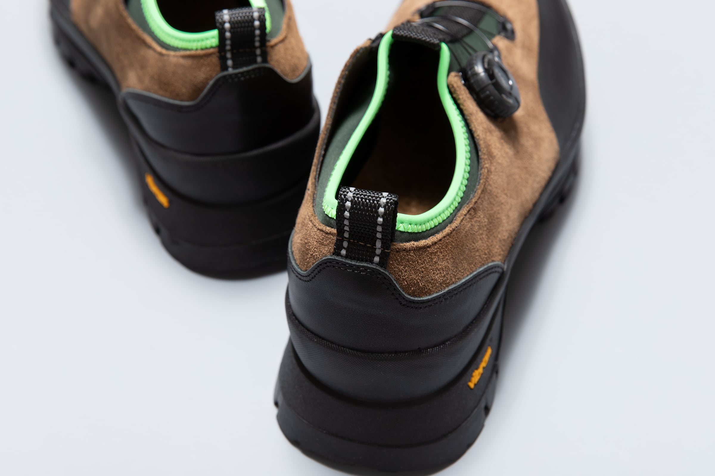 2025年秋冬の新色のOLIVERです。こちらは、内側のソックライナーの入口の縁のパイピングに差し色を入れて、アクセントを加えています。OLIVERは90年代にコアに人気があった、フランスのトレッキングシューズをイメージしたモデルです。現代的な視点とPLAYGROUND的なフィルターを通したデイリーユースなトレッキングシューズを作りました。トレック用のタフなイメージのvibramソールにスエードのアッパー。ネオプレーンのインナーソックにFREELOCKシステムでルックスと合理性、買いやすいプライスもこだわった1足です。