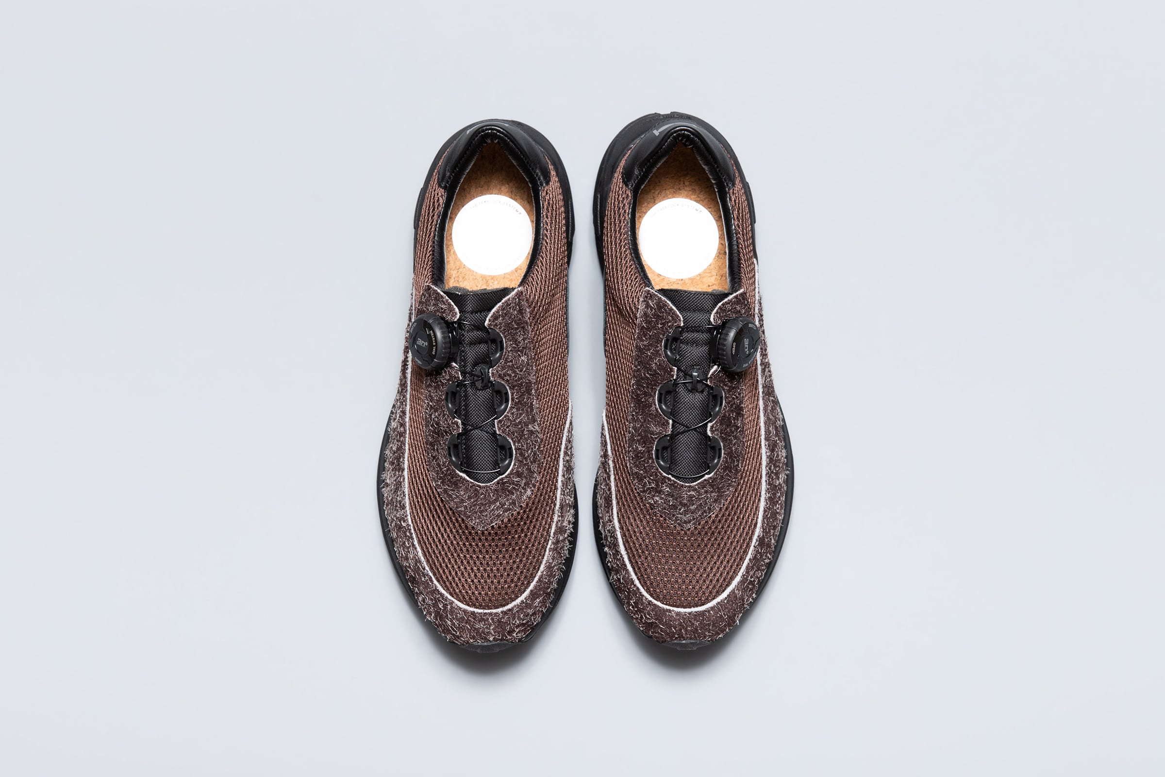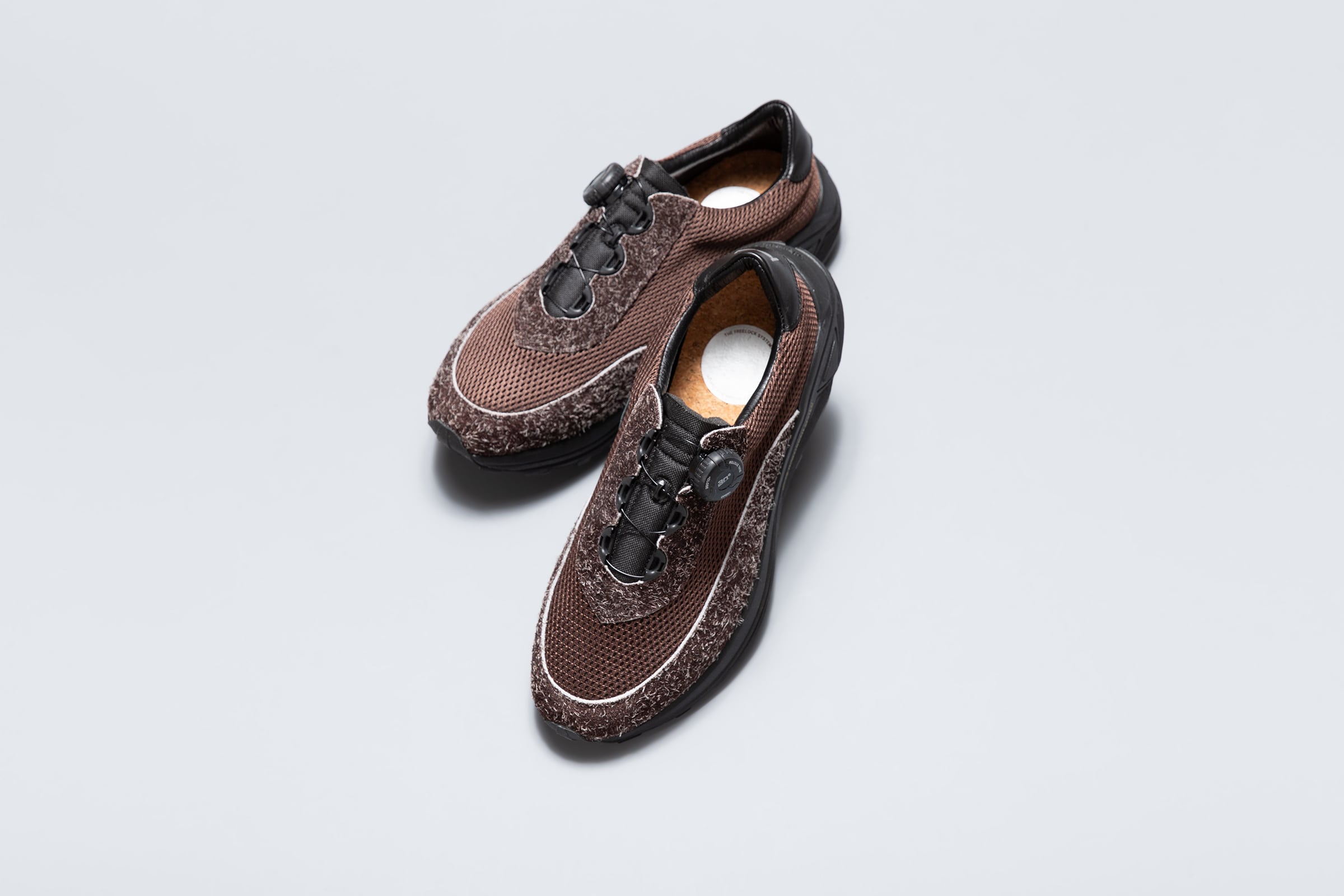 Introducing the first installment of NEW DAWN for Fall/Winter 2025. This special PLAYGROUND exclusive features dark brown mesh and fuzzy cow suede, perfect for the season. Suede on nylon mesh, FREELOCK on trail running soles by Vibram . Is this an evolved version of the retro running sneaker system? The answer is up to you.