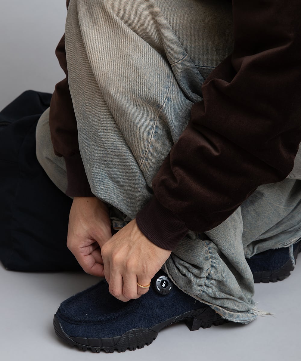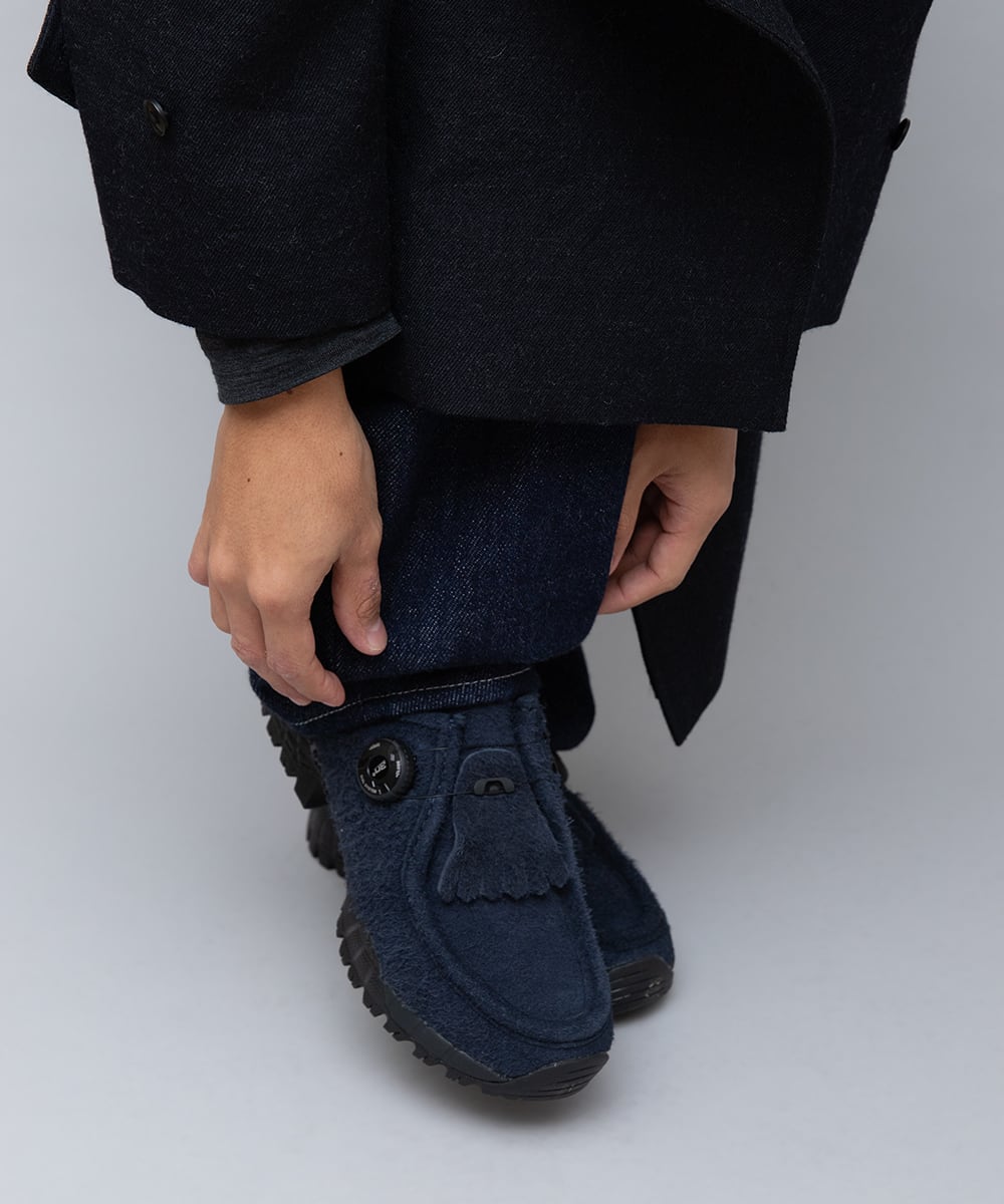 KNOCKの2025年秋冬の新色の登場です。濃いネイビーの毛足が長いシャギースエードで構成されたアッパー、ソールはブラックでまとめられた一足。また、防水透湿のメンブレンのKING-TEXをライナーに搭載しています。防水性とシューズ内の湿気をそとに逃がす、透湿性が向上した一足です。トレイルラン用のvibram社のソールにFREELOCKシステムは健在で、クラッシックな雰囲気を持たせつつスタイリッシュでモダンなシューズに仕上げました。買いやすいプライスにもこだわった一足。