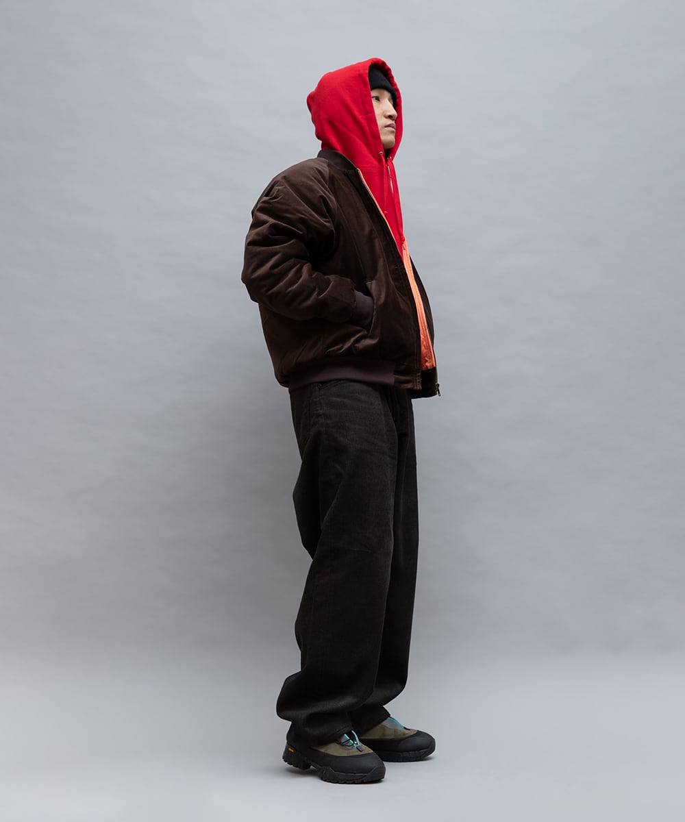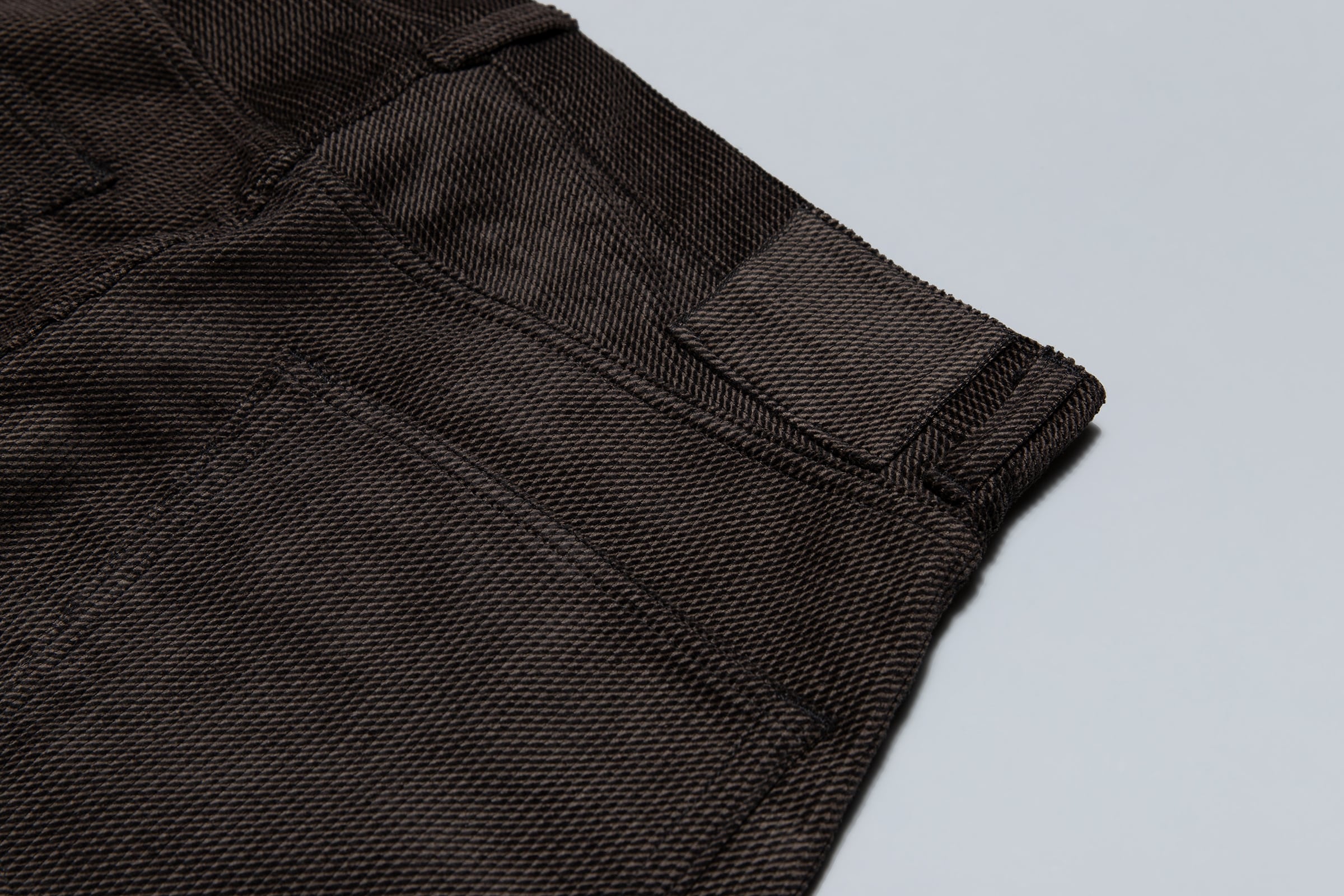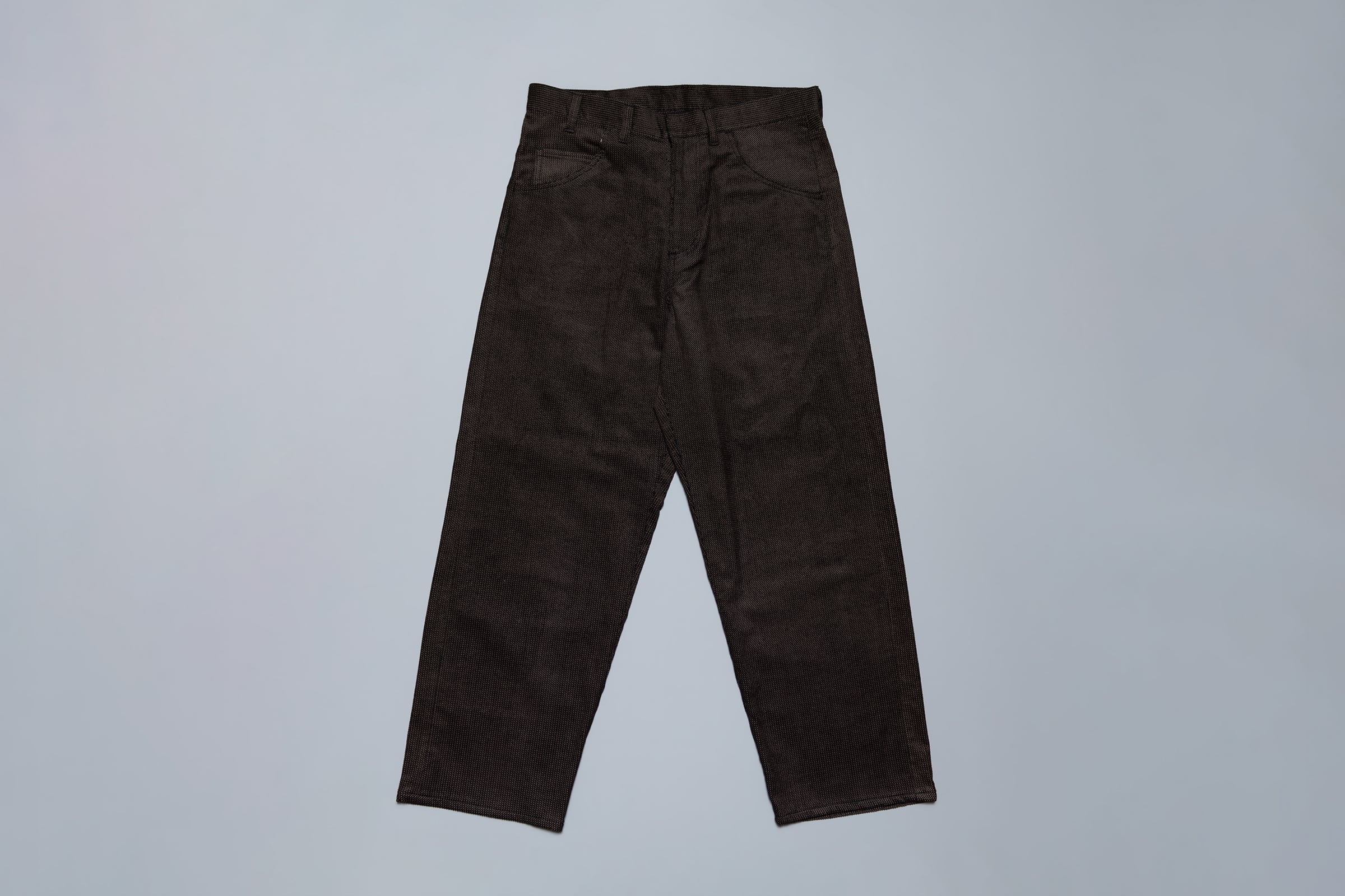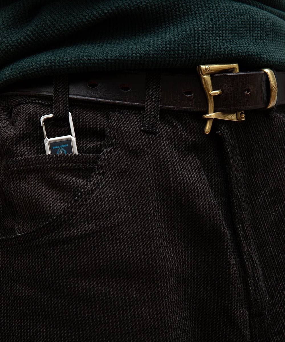 The fabric features evenly discharged sections from a black base, creating a unique look where the corduroy’s ridges blend with diagonal patterns. This process results in a distinctive shade that sits between brown and black. While black corduroy is often known for showing dust and lint, this fabric greatly reduces that concern. As with previous KPOCKET PANTS, they come with a loop for attaching a keyholder or carabiner, along with a small key pocket placed just beneath the loop. The design has been updated with a snap button closure at the front and an internal drawcord, making them easier to wear. The silhouette is a relaxed fit with a slight taper. Made in Japan.