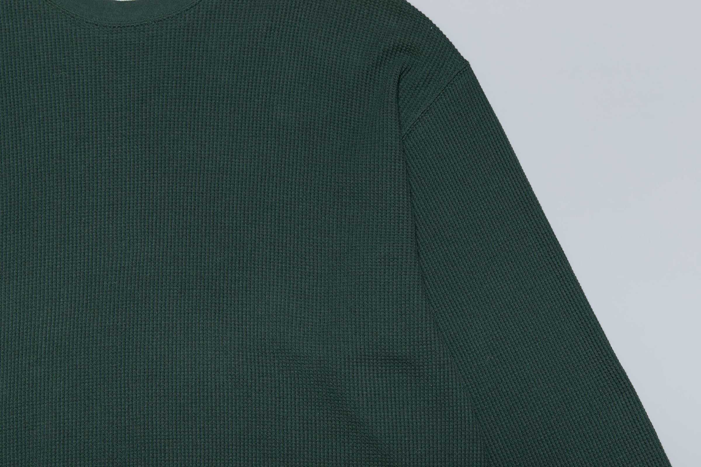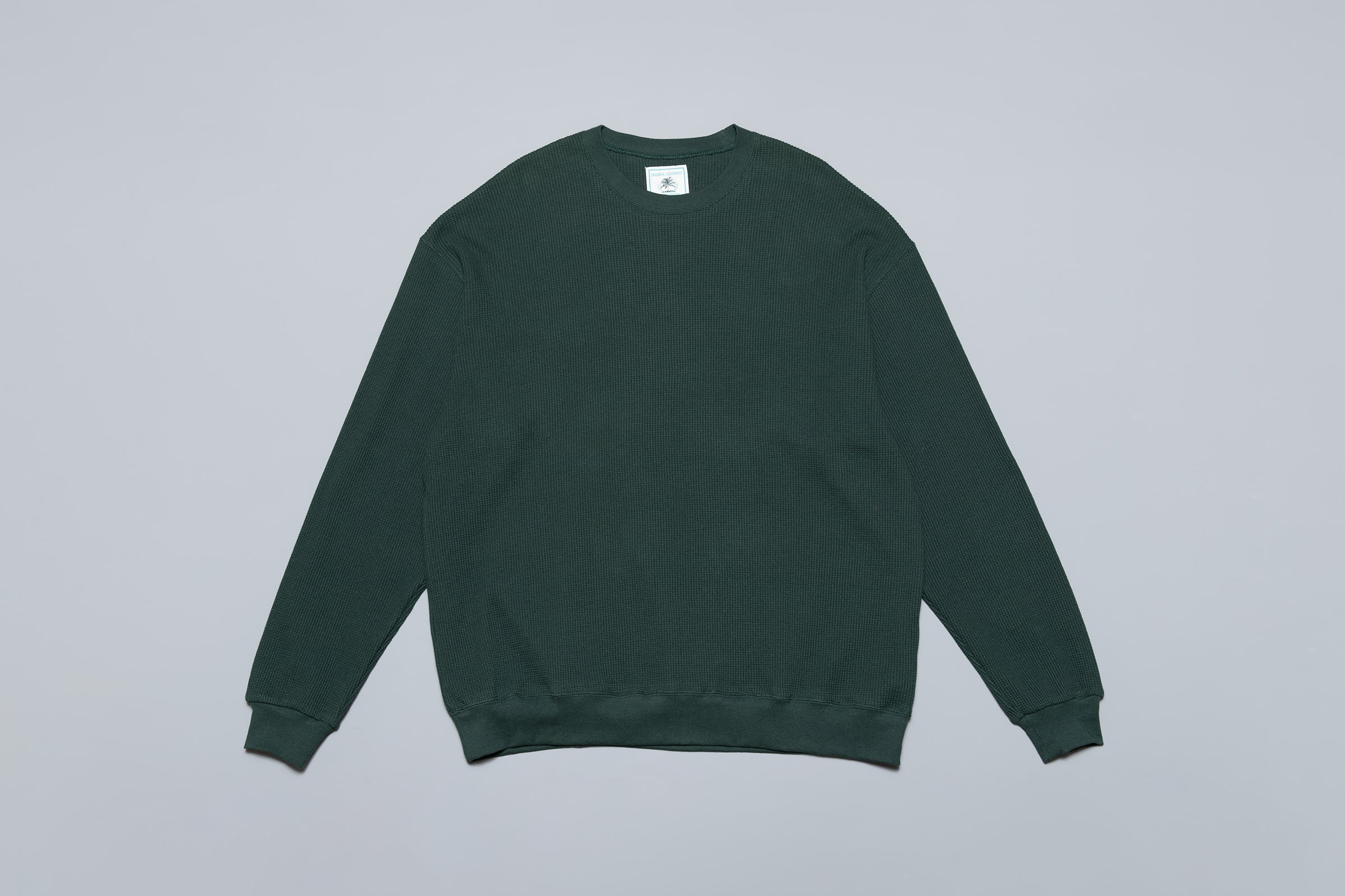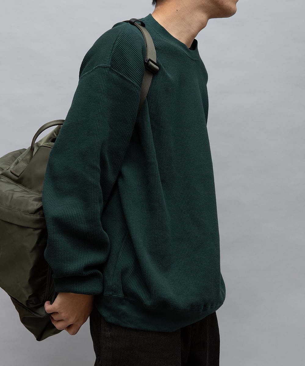 This is a classic sweatshirt-style thermal from O.E.M. Thermals are typically designed for innerwear purposes, so they are often tight-fitting and prioritize insulation. However, we created this thermal with a completely different approach. We considered not only wearing it as an inner layer but also wearing it as a standalone piece, so we designed it in a sweatshirt-like style with a comfortably loose body width and ribbed hem. The silhouette is easy to wear and does not accentuate body lines. Moreover, rather than focusing on warmth, we aimed for a cool and comfortable feel for spring and autumn, so we used a lightweight and dry-textured cotton thermal fabric with a moderate subtle texture. The typical rustic look of thermals has been diminished, and you can enjoy wearing it with an elegant impression similar to cotton knitwear. Made in Japan.