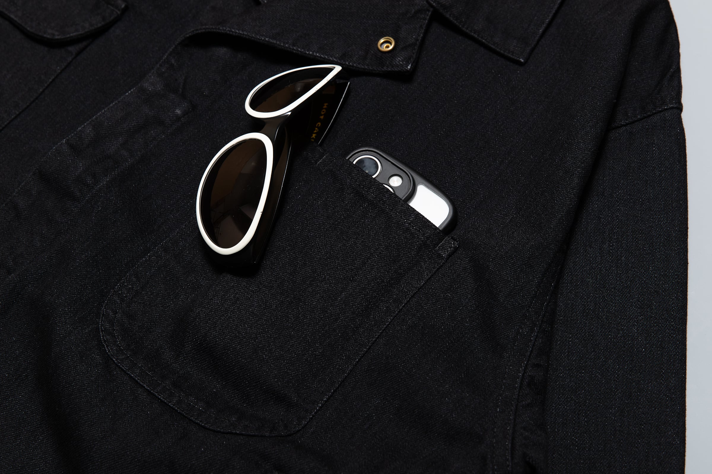 このジャケットは、1960年代のアメリカンヴィンテージのオールインワンをベースに、ウエストから下がカットされたようなデザインが特徴です。カバーオールのようなデザインですが、デニムジャケットに近い着丈で、新鮮な印象を与えます。oem06の"KPOCKET PANTS"の黒と組み合わせればセットアップとして着用でき、裾のドローコードを絞ることで、オールインワンのようなスタイルを演出できます。個人的に、オールインワンをファッションとして着ることに憧れがありましたが、着こなしの難易度や着用頻度、扱い辛さの面で悩ましく感じていました。同じような気持ちをお持ちの方にも、このセットアップを通して、時にはオールインワンの雰囲気を気軽に楽しんでいただけたら嬉しいです。胸ポケットはスマートフォンが無理なく収まる、現代的なサイズ感で設計されています。日本製です。