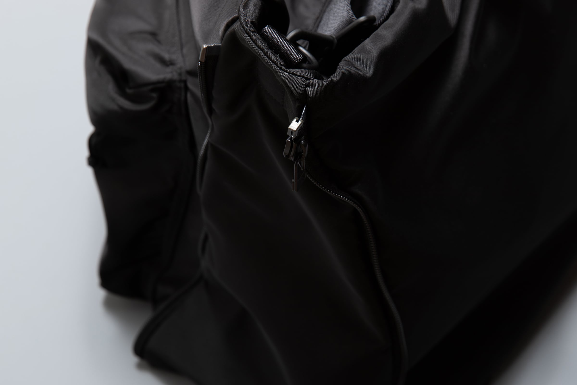 EX HELMET BAGの「EX」は二つの意味が含まれます。一つは「EXTREME」。イタリアのLIMONTA社の高級ナイロンを使用し、私が考え得る最高なヘルメットバッグが完成しました。もう一つは「EXPAND」。サイドのジッパーを開閉することで容量やシルエットを大きく変えることができます。できる限りヘルメットバッグの本質は保ちつつも、ワイズを広めにとって横長のフォルムにし、肩掛けした際のフィット感や落ち感を重要視しました。ジップを閉じるとブリーフケースのようなフォルムになり、また13インチノートPCやA4ファイル等が入る内ポケットも完備しておりますので、ビジネスシーンにお使いいただくのもおすすめです。日本製です。