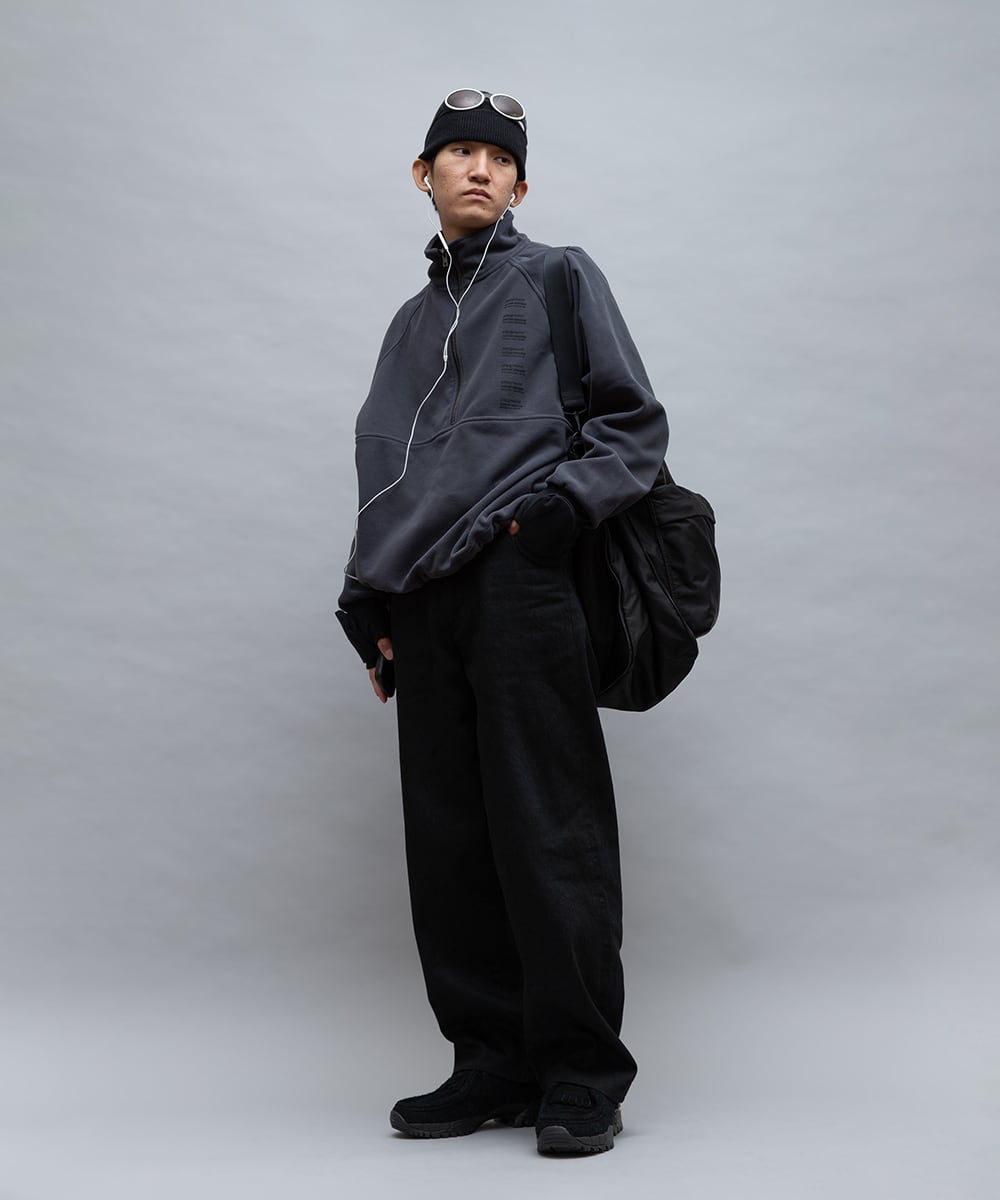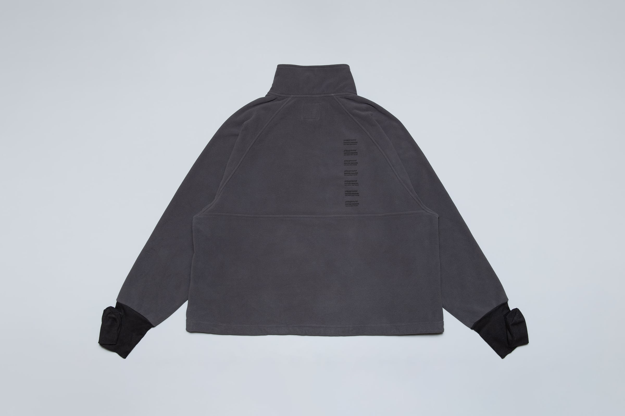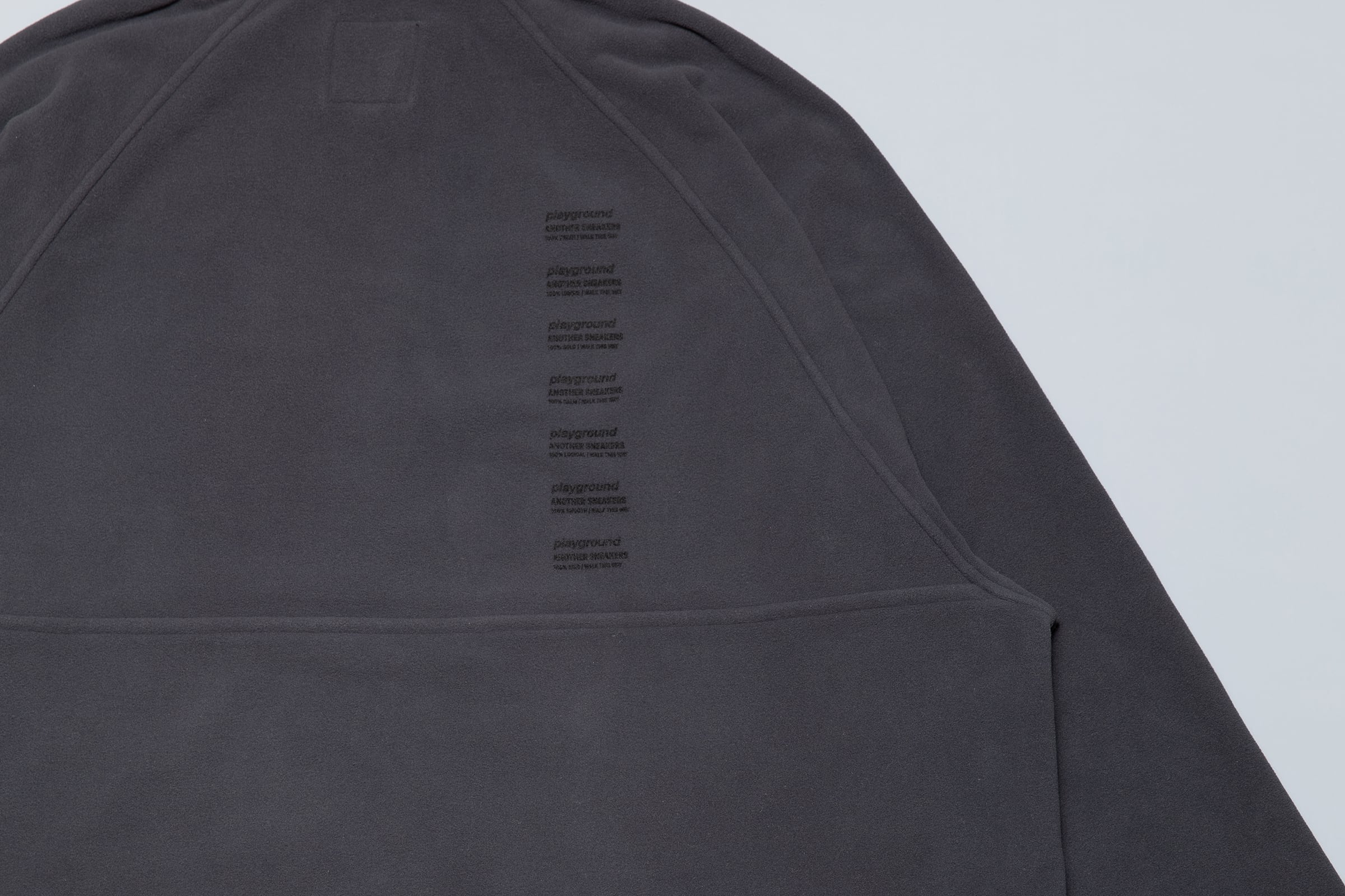 This is a PLAYGROUND exclusive half-zip fleece. This special edition features charcoal gray with black hand warmer ribbing. The logo, a favorite seven-link design created for our 7th anniversary, is printed on both the front and back. We felt this piece, with its subtly integrated logo rather than a bold statement, perfectly matches the mood for this fall/winter season. Hence, the print color was chosen to match the hand warmer ribbing in black. While printing isn't the most ideal technique for brushed fleece, we deliberately opted for printing over embroidery. It's a piece where you can look forward to seeing how the logo area ages over time.