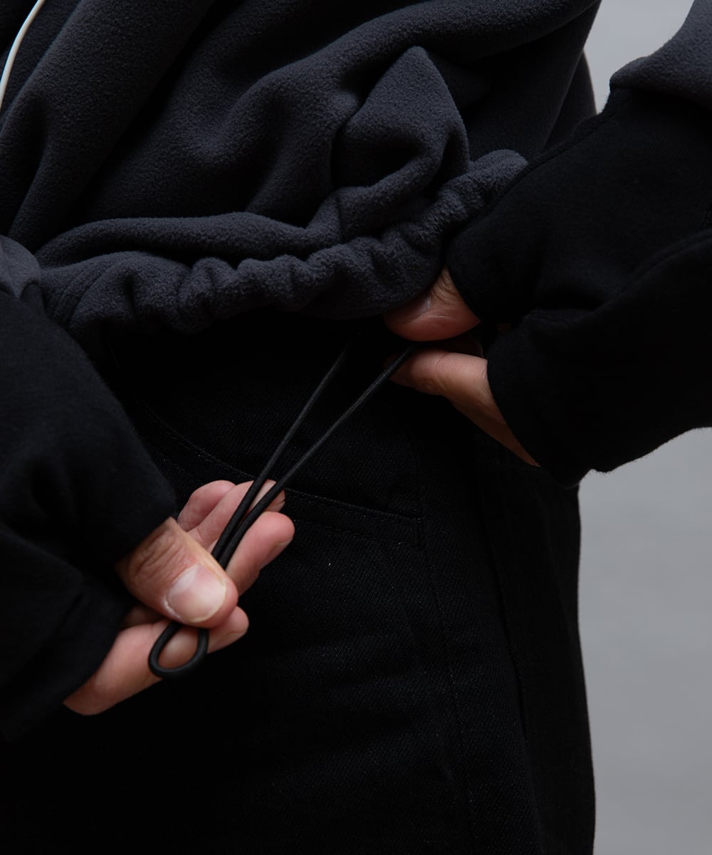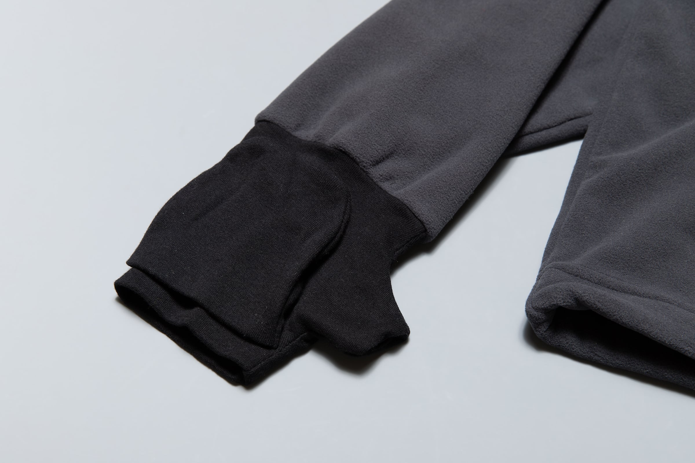 This new fleece piece features hand-warmer rib cuffs—a staple detail for the fall/winter season. Rather than simply switching the neckline to a half-zip, we redesigned the pattern entirely: adopting raglan sleeves, widening the armholes, and adding a drawcord at the hem to create a fit that can be worn almost like an outer layer. As with the previous model, we use POLARTEC® fleece, but this season it has been upgraded to an even smoother and more refined fabrication. The cotton rib cuffs offer a 3-way construction: secure them at the wrist, slip your thumb through the opening, or pull them over your hands like mittens. Made in Japan.