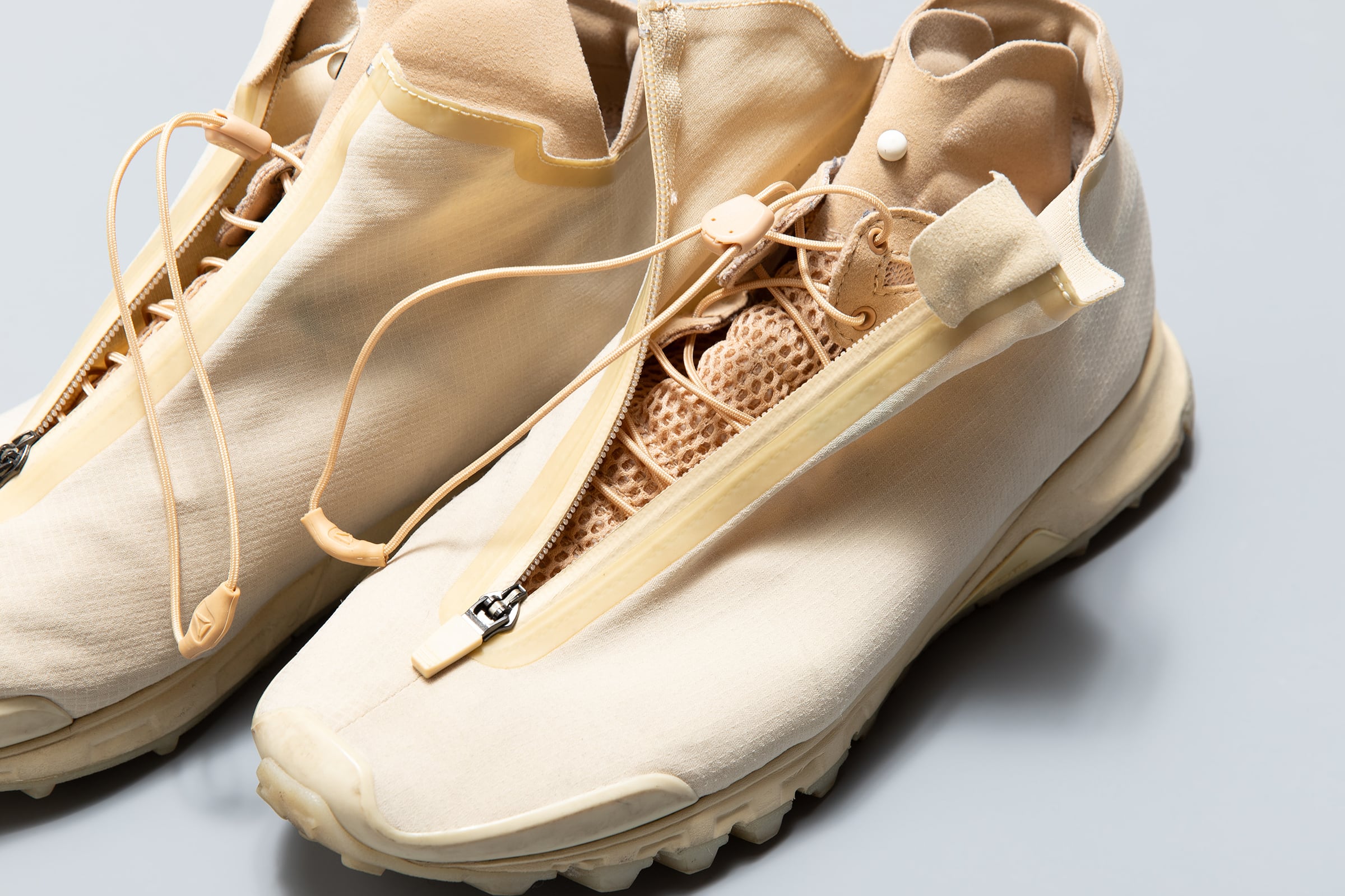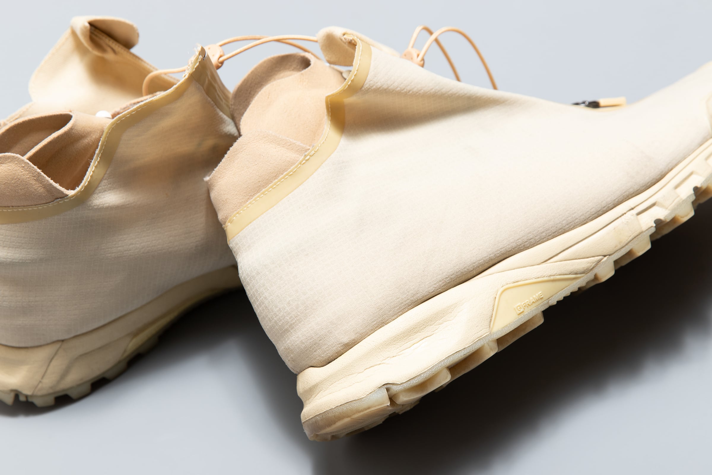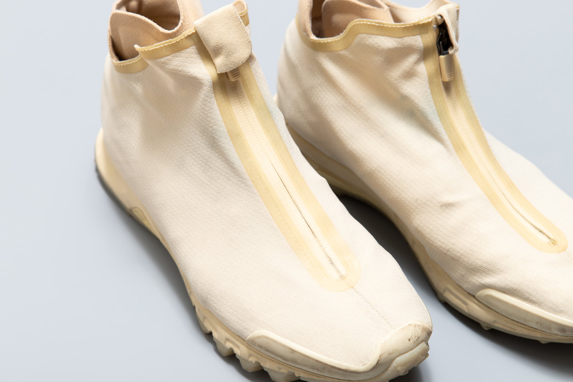 This is one of the collaborative models between Reebok and COTTWEILER. Inspired by the Sahara Marathon, this design features a two-layer construction: an upper with a center zip closure and an inner layer adjustable with a drawcord. The design clearly reflects its purpose of preventing sand and dust from entering the shoe. While showing some signs of wear in places, the overall condition is relatively good. The insole had deteriorated, so it has been replaced with a new one.