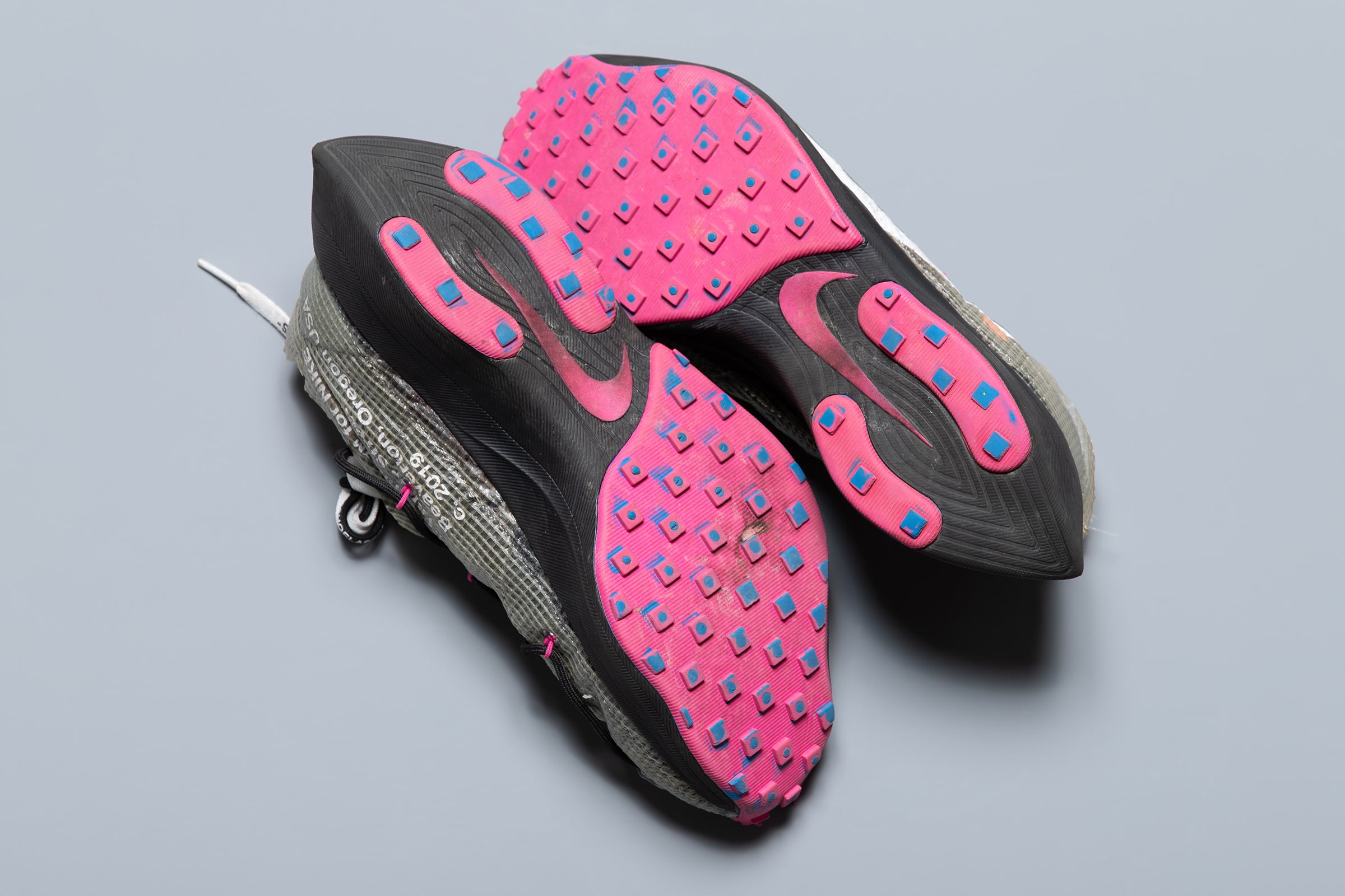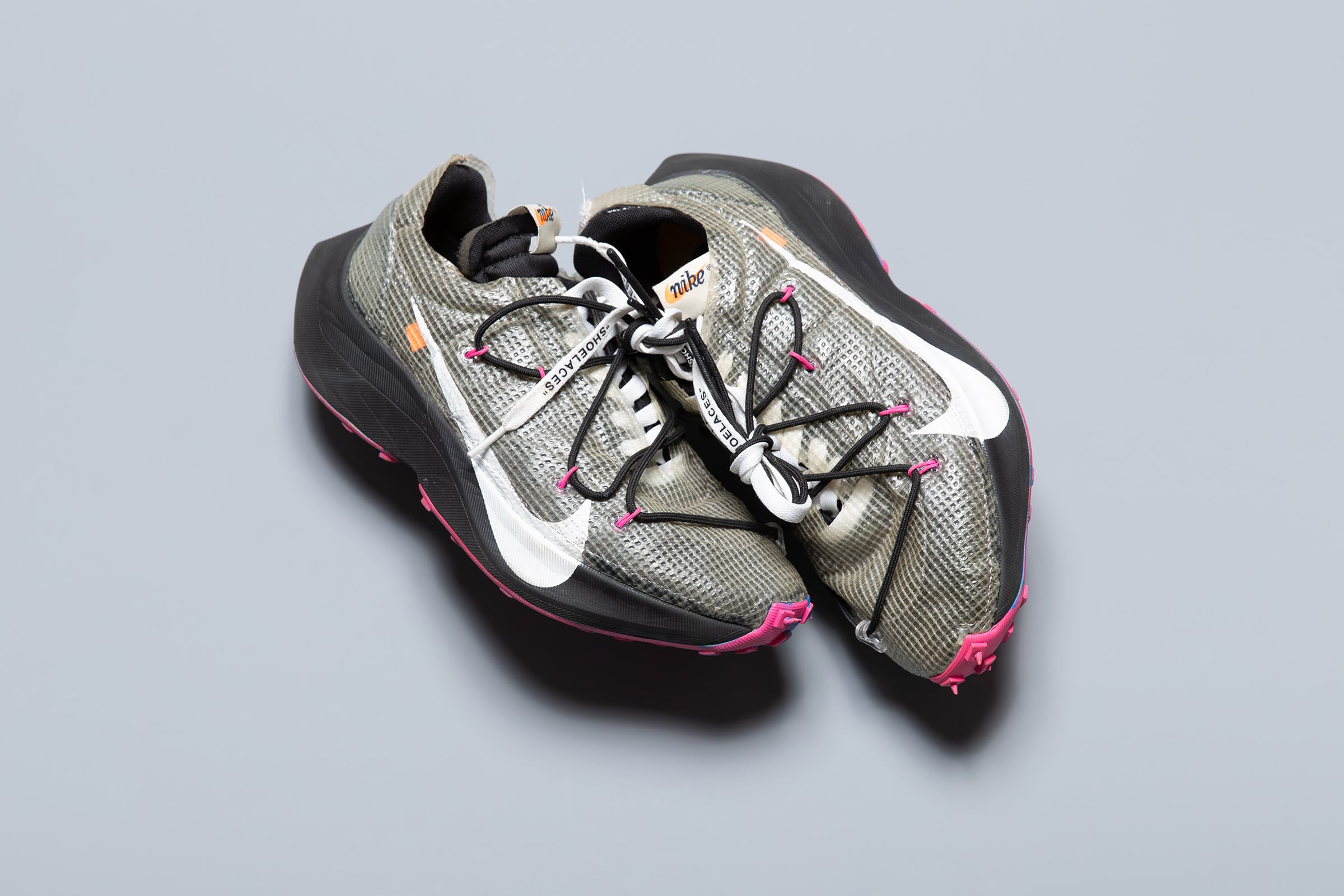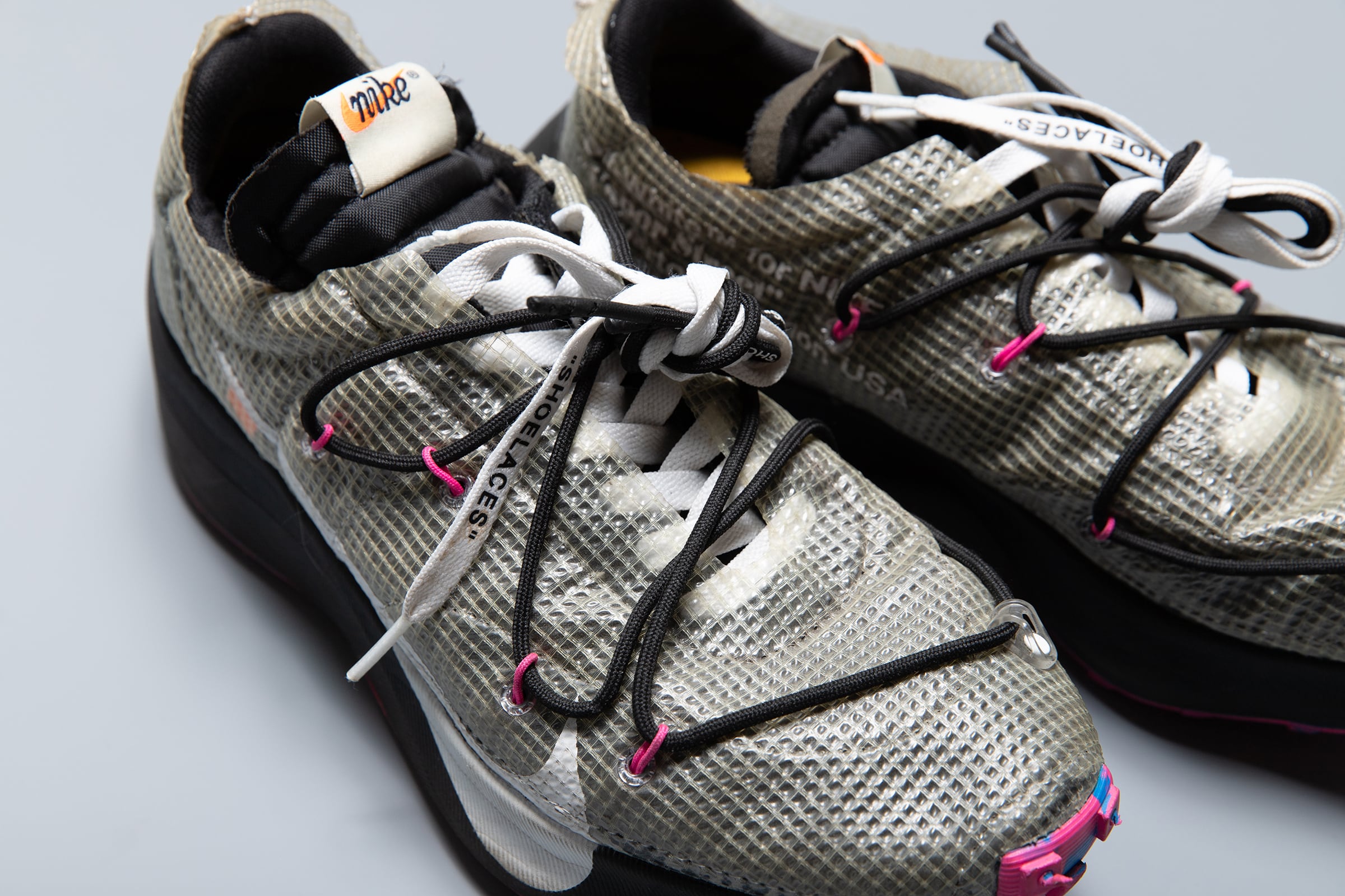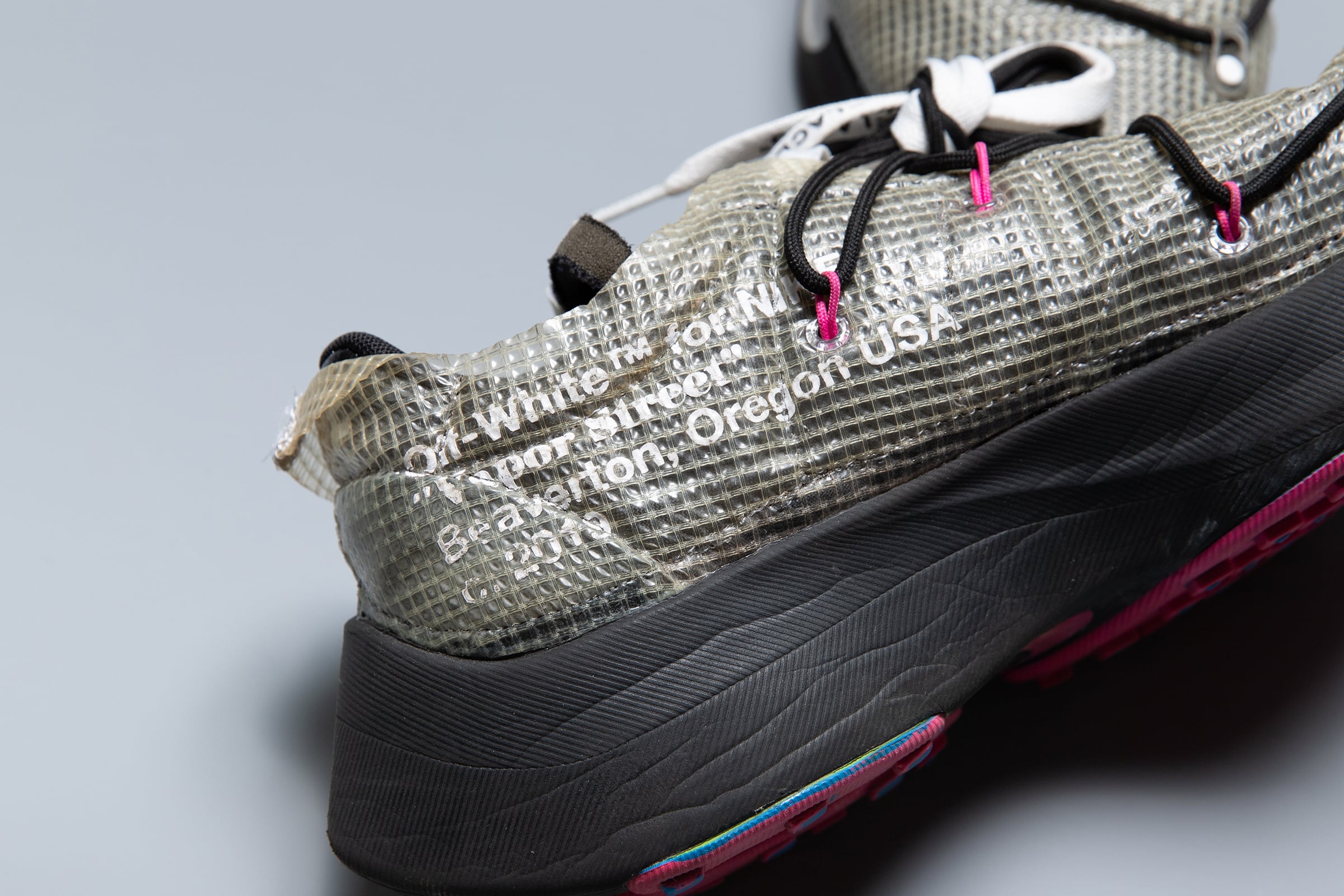 This is a collaborative shoe between NIKE and Off-White. The VAPOR STREET model was created inspired by female track athletes. It is said to be based on a marathon shoe. In today's climate where fitness culture like running is expanding while sneaker momentum is waning, this is a model we recommend. Amidst an information overload and the rise of affordable fashion and influencer brands, we propose this Off-White collaboration shoe designed by Virgil Abloh—the pioneer of luxury streetwear who led the fashion industry. It's not trendy. It doesn't carry a premium resale price. Its recognition is relatively low. Precisely because it's such a model, you need to make the effort to choose it yourself. That's the kind of model it is. This is a women's style, so the sizing runs slightly small. Recommended for those around US size 9 (27cm). Made in 2019. It shows signs of use, with the sole's tread points mostly worn down, but the sole itself has minimal damage.