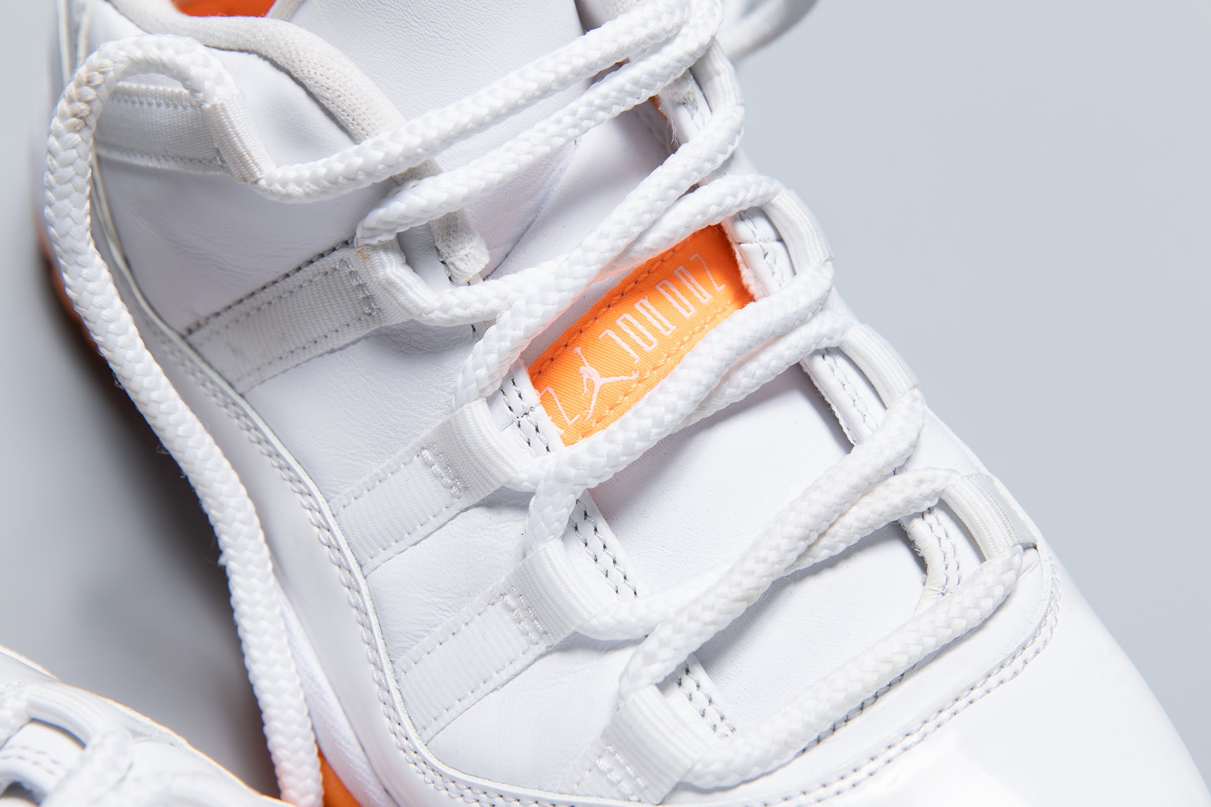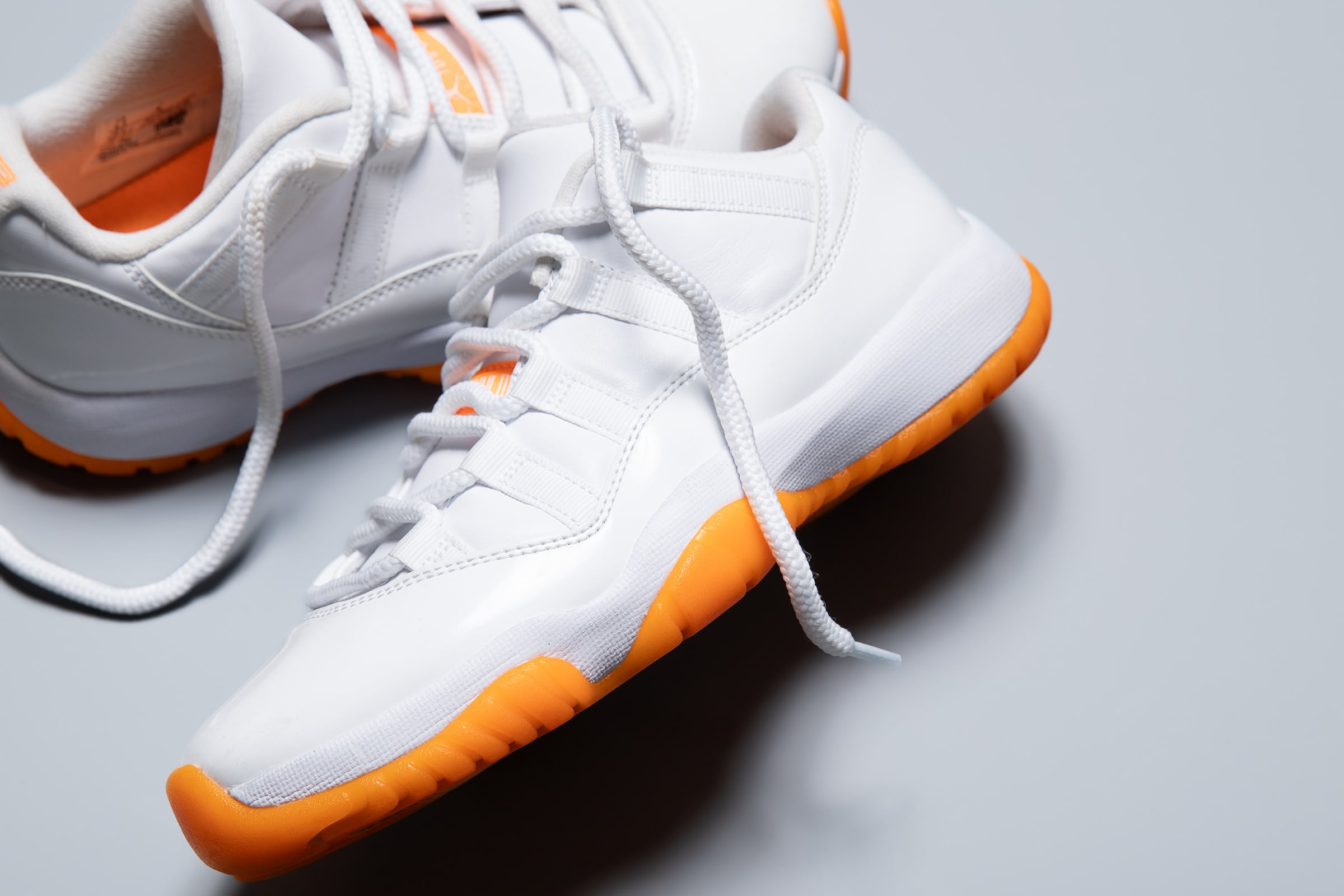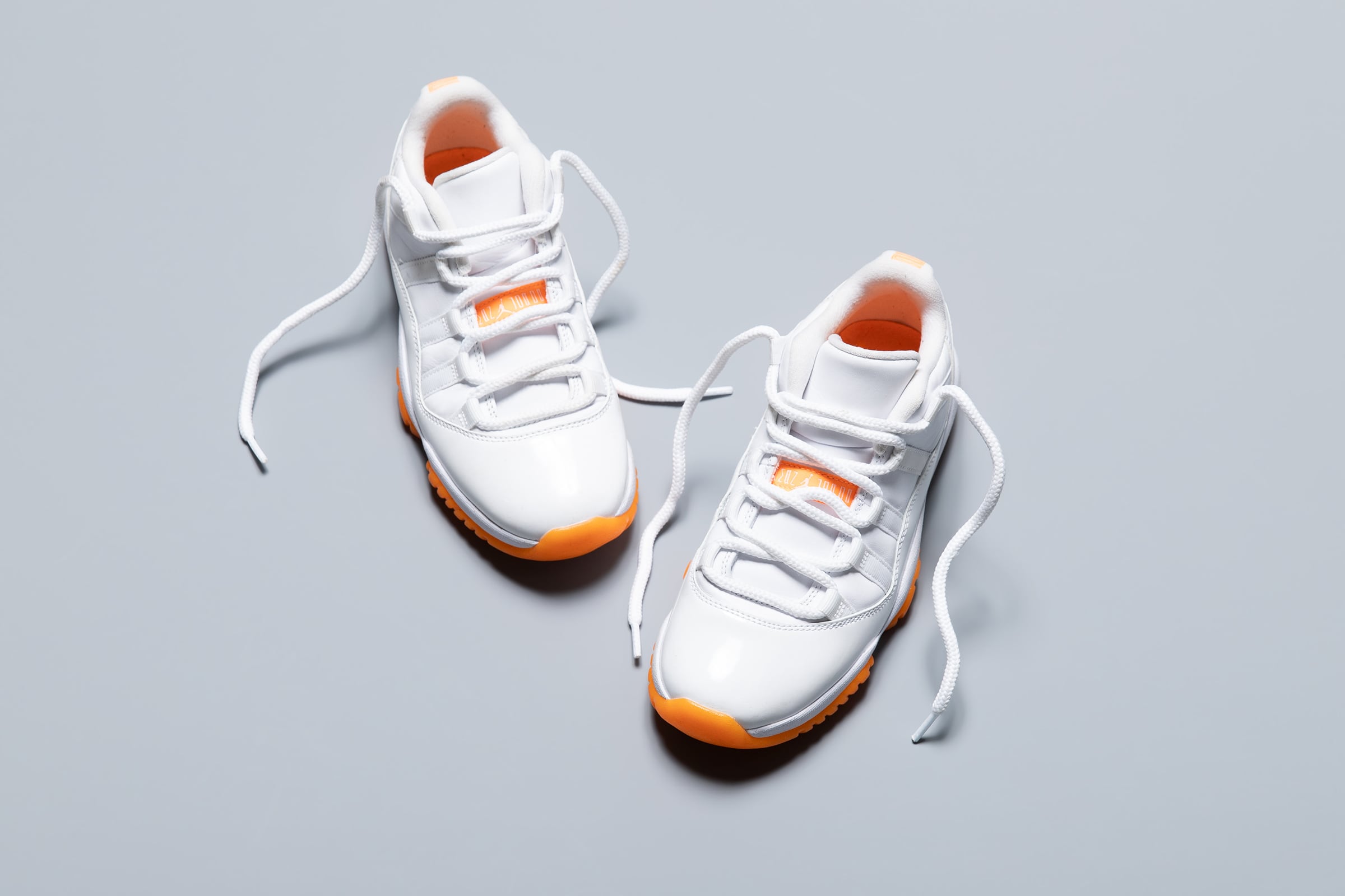This pair features a slightly rare colorway from the iconic Jordan 11 series. While primarily white, the sole and heel area are accented with scattered orange details, making it a perfect choice for the upcoming season. Made in 2020. It shows some signs of wear and minor dirt, but it's still a pair you can wear.