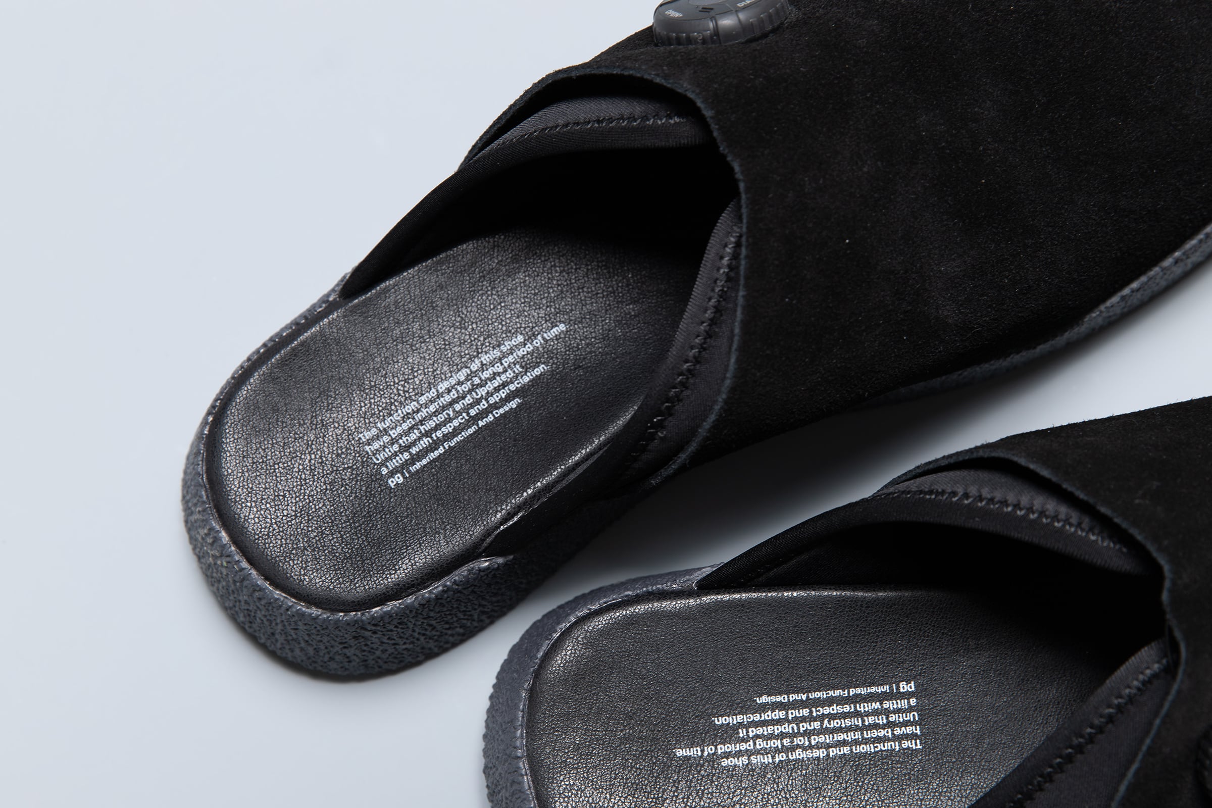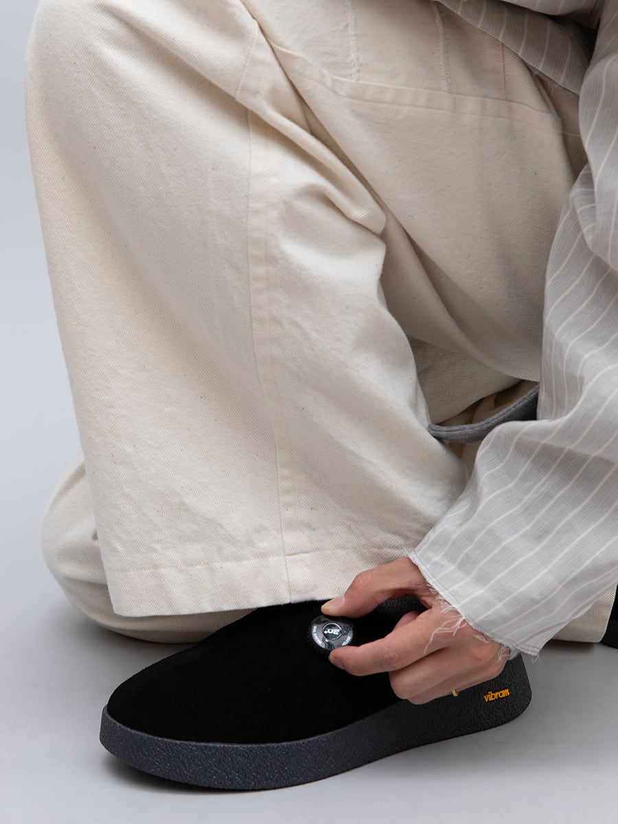 These sandals are adjustable, sabot-type sandals with a double-layer construction. The outer layer is made of cow suede and the inner layer is made of neoprene. These functional sandals can be held in place for ease of movement during active activities, and loosened for relaxation when sitting down to rest after a long day of travel. The sole uses a vibram® crepe sole taste sole. The use of this sole gives the sandal an authentic feel. EMPTY is a next-generation sandal that is both functional and has a somewhat traditional aspect.