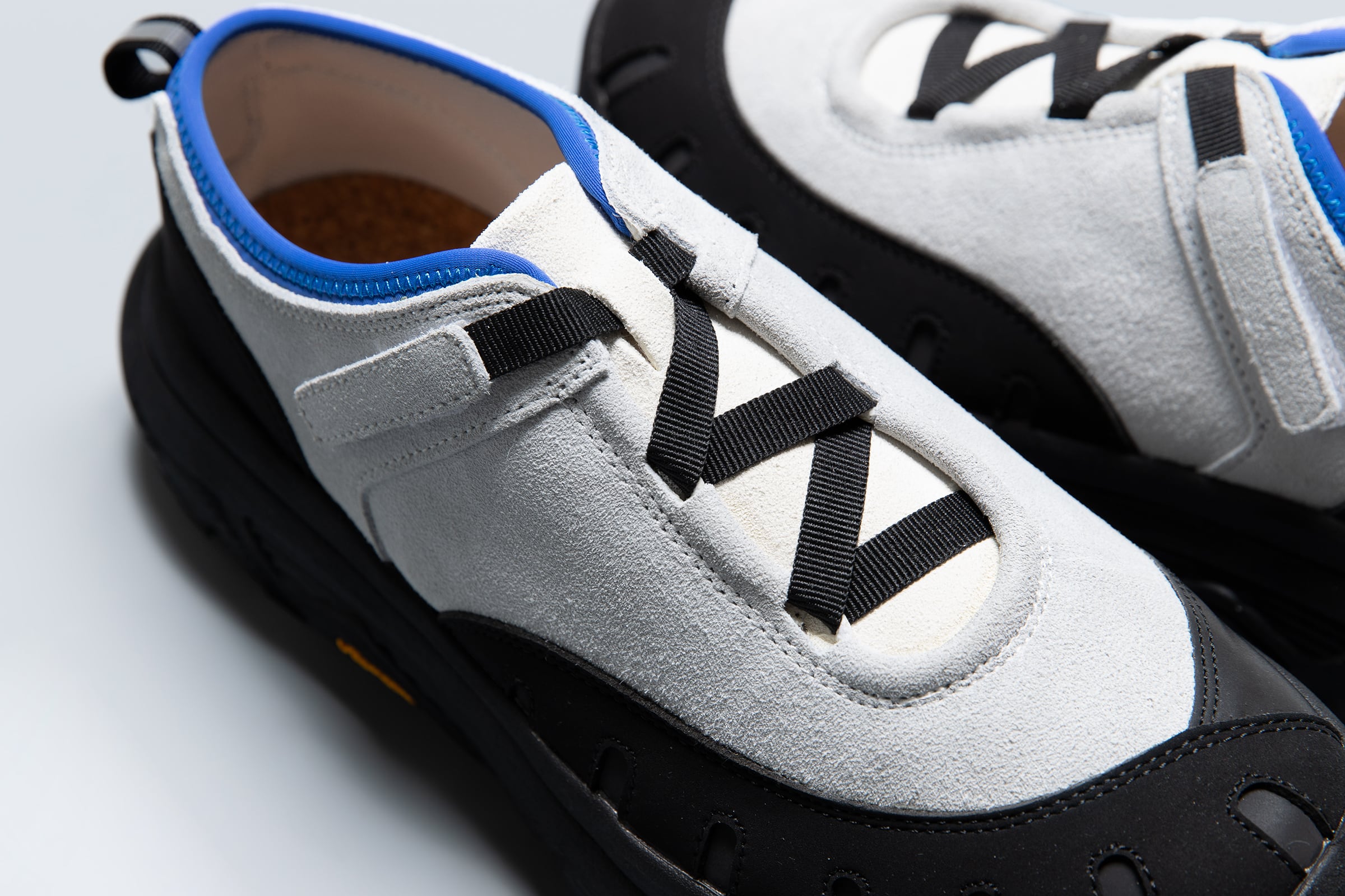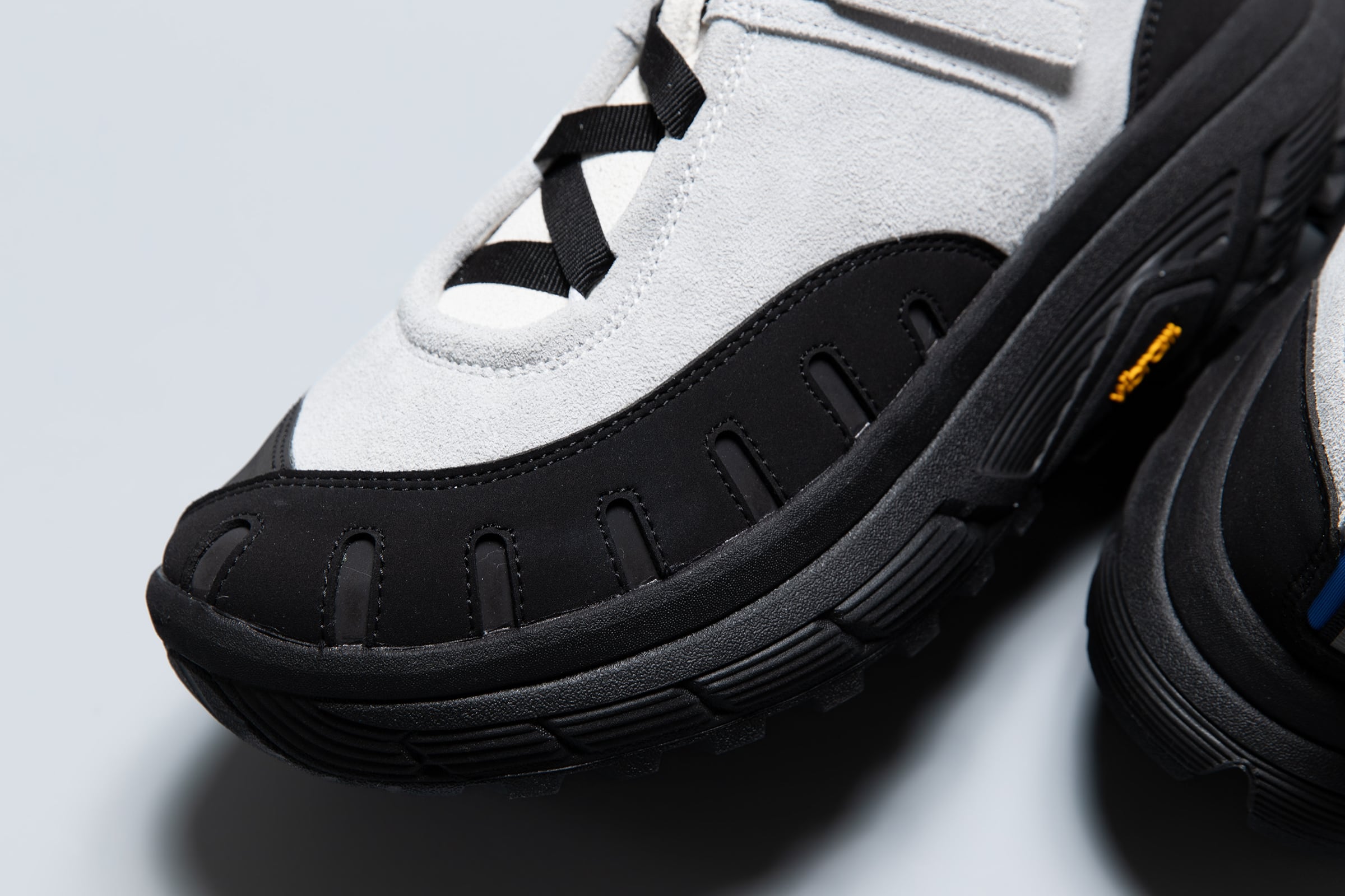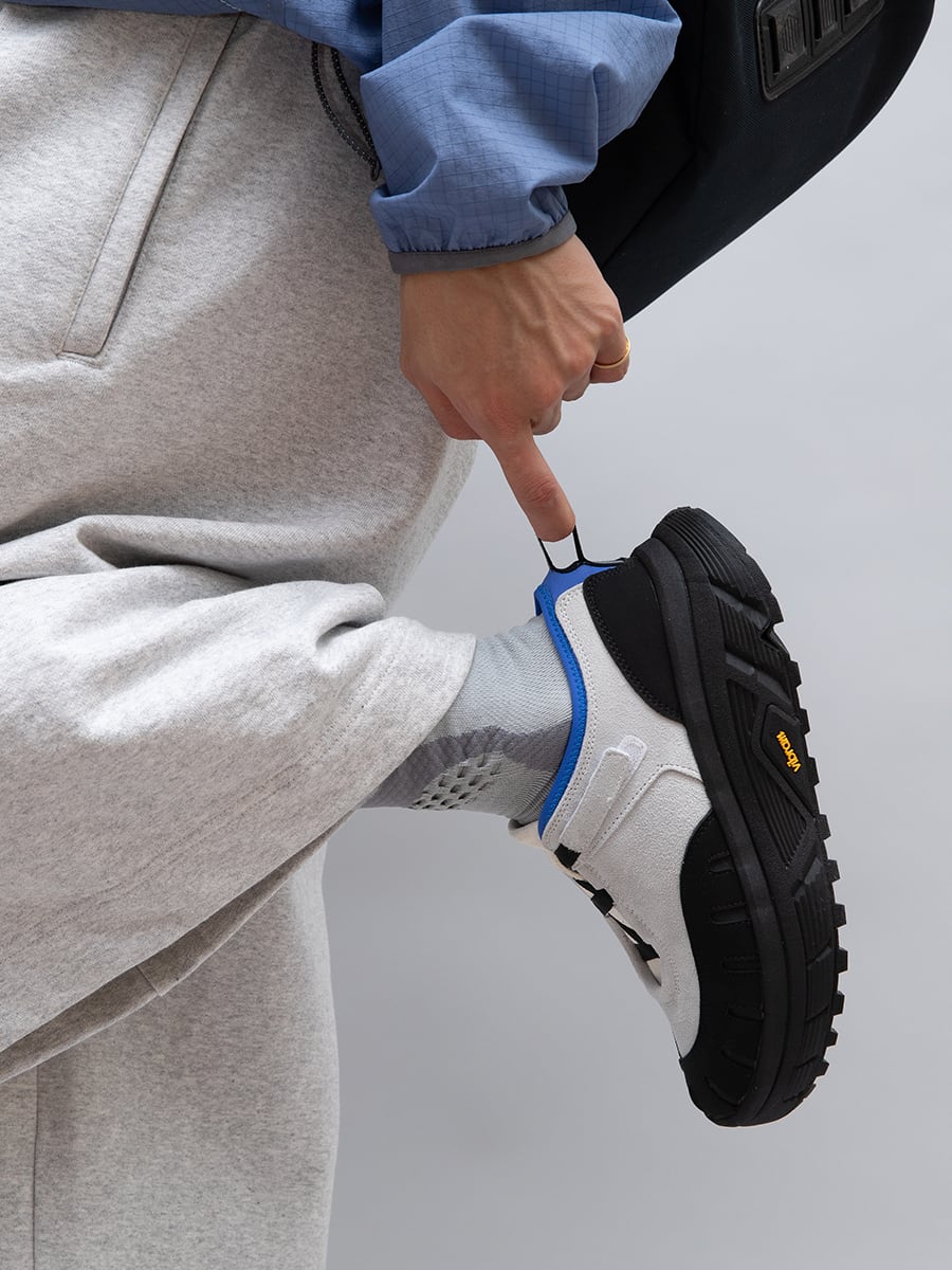 pg LADYBUGです。シューレースではなく、10mm幅のテープでアジャストできる仕様です。こちらも紐が解けて結び直す、煩わしさを解消するアジャストシステムです。ソールはvibram®のボリュームあるトレイルラン用のソールです。底あたりも柔らかく、推進力が働くソールを使用してます。トゥガードのパーツが、外側だけ2重になっています。内側(下側)がリフレクターパーツを使用し外側(上側)の7つのホールよりリフレクターが機能して反射する仕様です。丸みがある愛嬌のあるフォルムと、7つのホールが光ることで7星になぞらえ、ナナホシテントウ「LADYBUG」と名付けました。