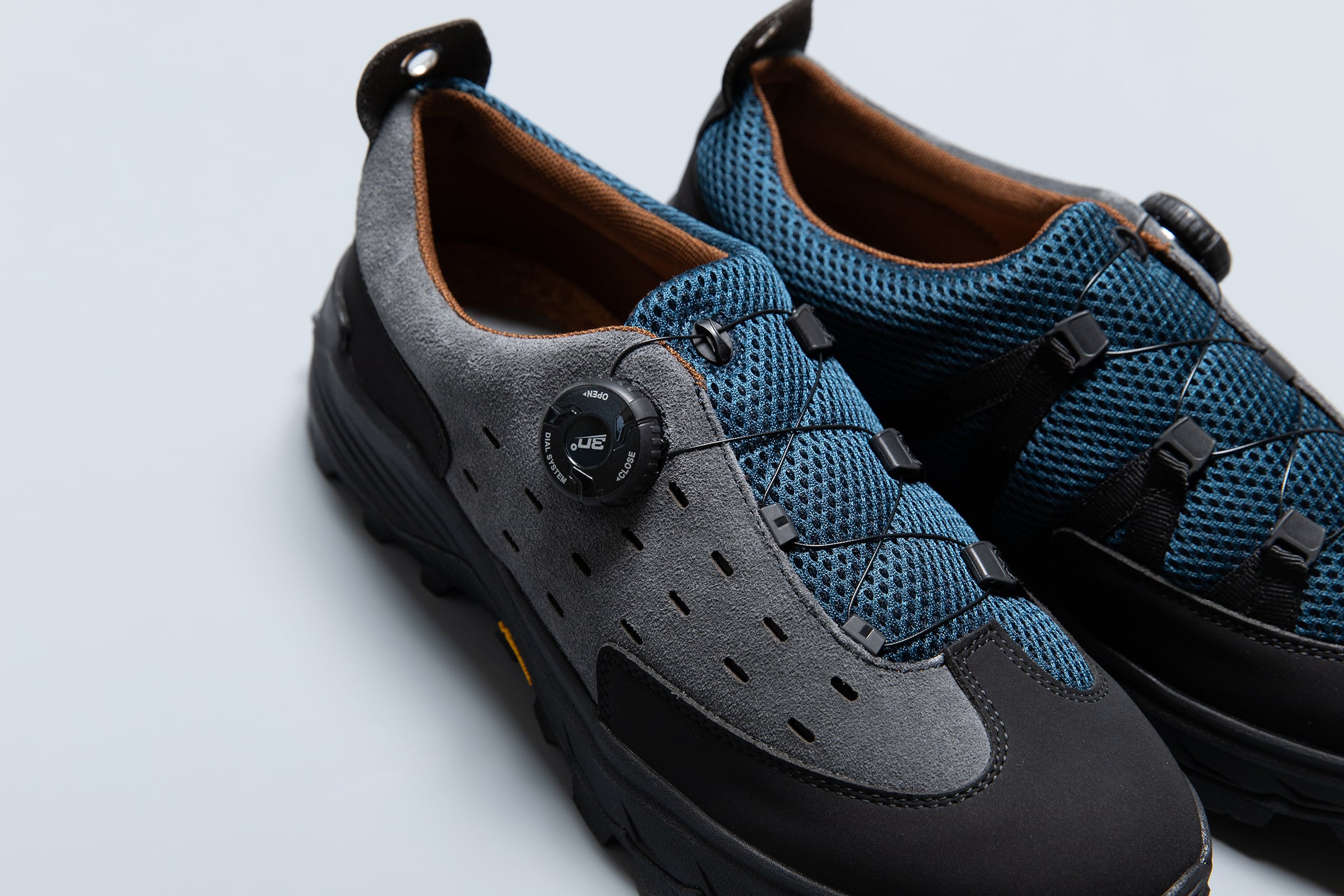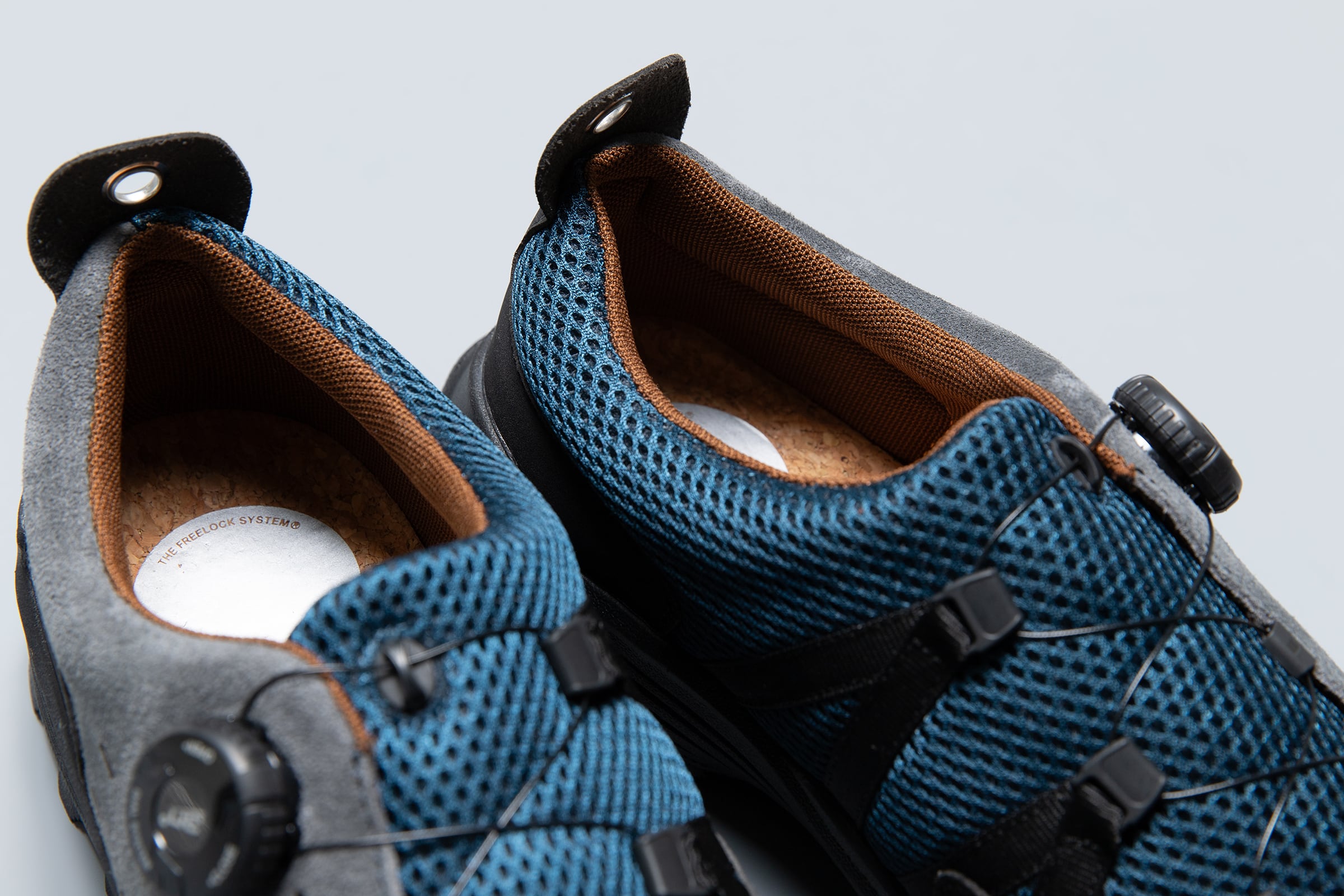 このシューズの特徴は、シュータン(ベロ)が無く内側と外側の2つのパーツで構成されています。FREELOCKで締めると内側のパーツが外側のパーツの下に滑り込み、フィッティング調整する仕様になっています。ありそうで無い仕様とデザイン、そして内側と外側で違う表情が味わえるのが、このシューズの魅力ではないでしょうか。ソールはvibram社のトラクション・ラグという新機能が付随しているソールを使っています。トラクション・ラグとは、細かい凹凸が履いて荷重がかかることにより、ソールの接地面積が最大50%アップし、それにより地面をしっかり捉え、従来のソールより前に踏み出す力が25%増える機能的なソールです。大地を噛みしめる感覚を体感しながら、お気に入りの街を歩いて欲しい、そんな一足です。