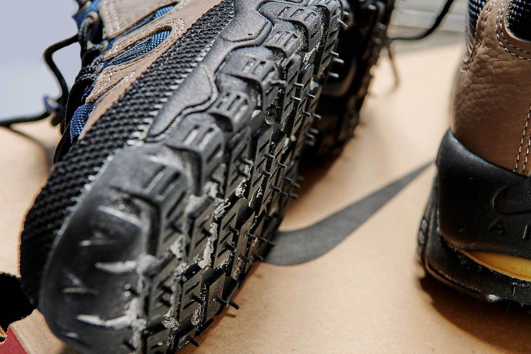 It is a 1997 NIKE TORRID MID. One pair from the NDESTRUCKT series. I feel the charm of this shoe in the pattern making cut into teardrops on the upper and sides. It will be an unused dead stock with a box. Therefore, we do not dare to repair anything. The visible air on the heel is crushed and does not function as air. Perhaps the bond between the upper and sole has deteriorated since the age. If you wear it, the sole and upper may come off. Only for domestic customers, in that case, if you bring it, we will bottom it out again.