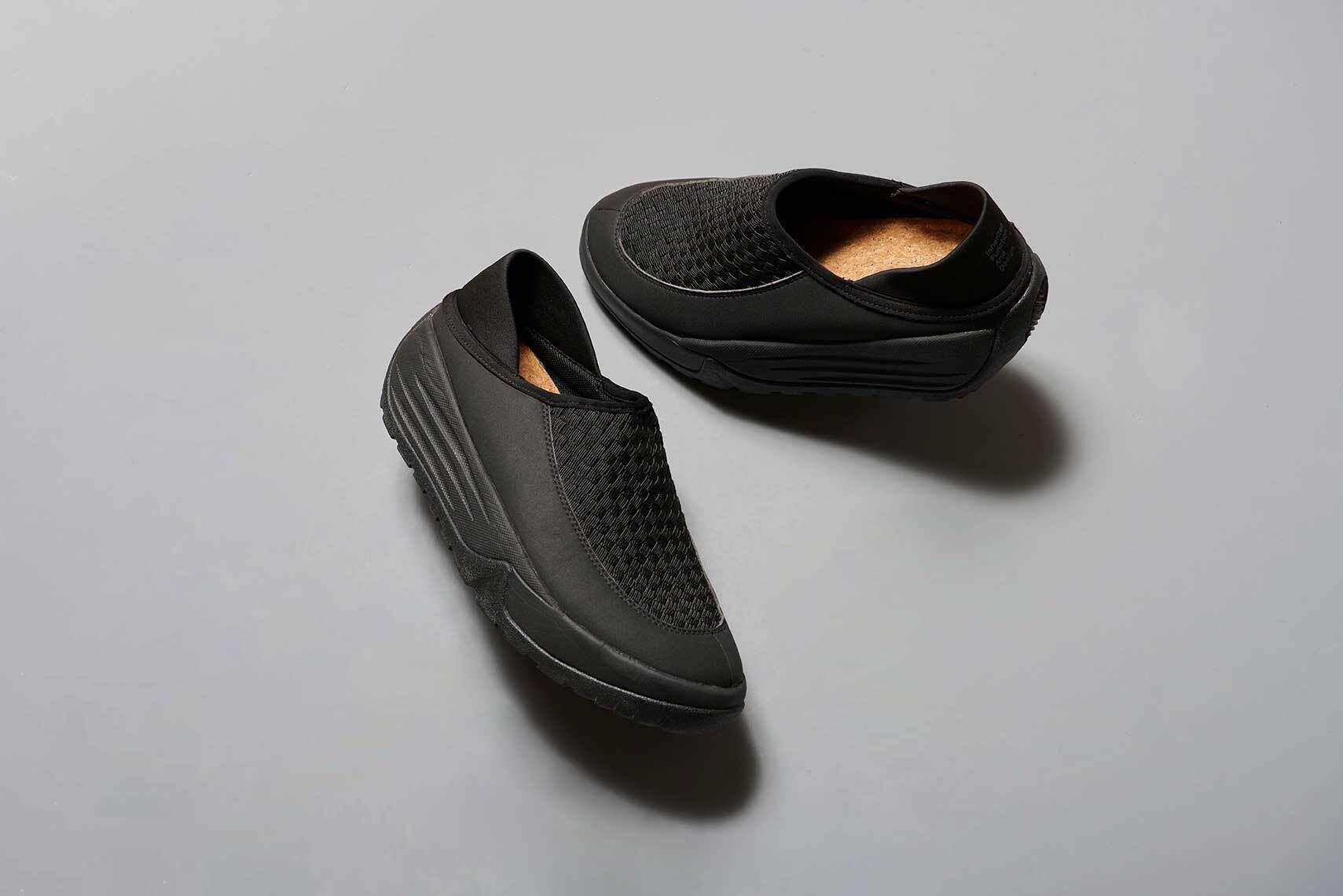 A spring/summer version of the GARDEN MOC that was well received in the fall/winter season. The upper and instep are made of woven material for good breathability and a cool look. The heel part is made of neoprene, a soft and stretchy material, and can be worn as mules by tipping them down and stepping on them. When walking, they can be raised and hooked onto the heel for easier walking. The thick sole and rounded shape make for an attractive pair.