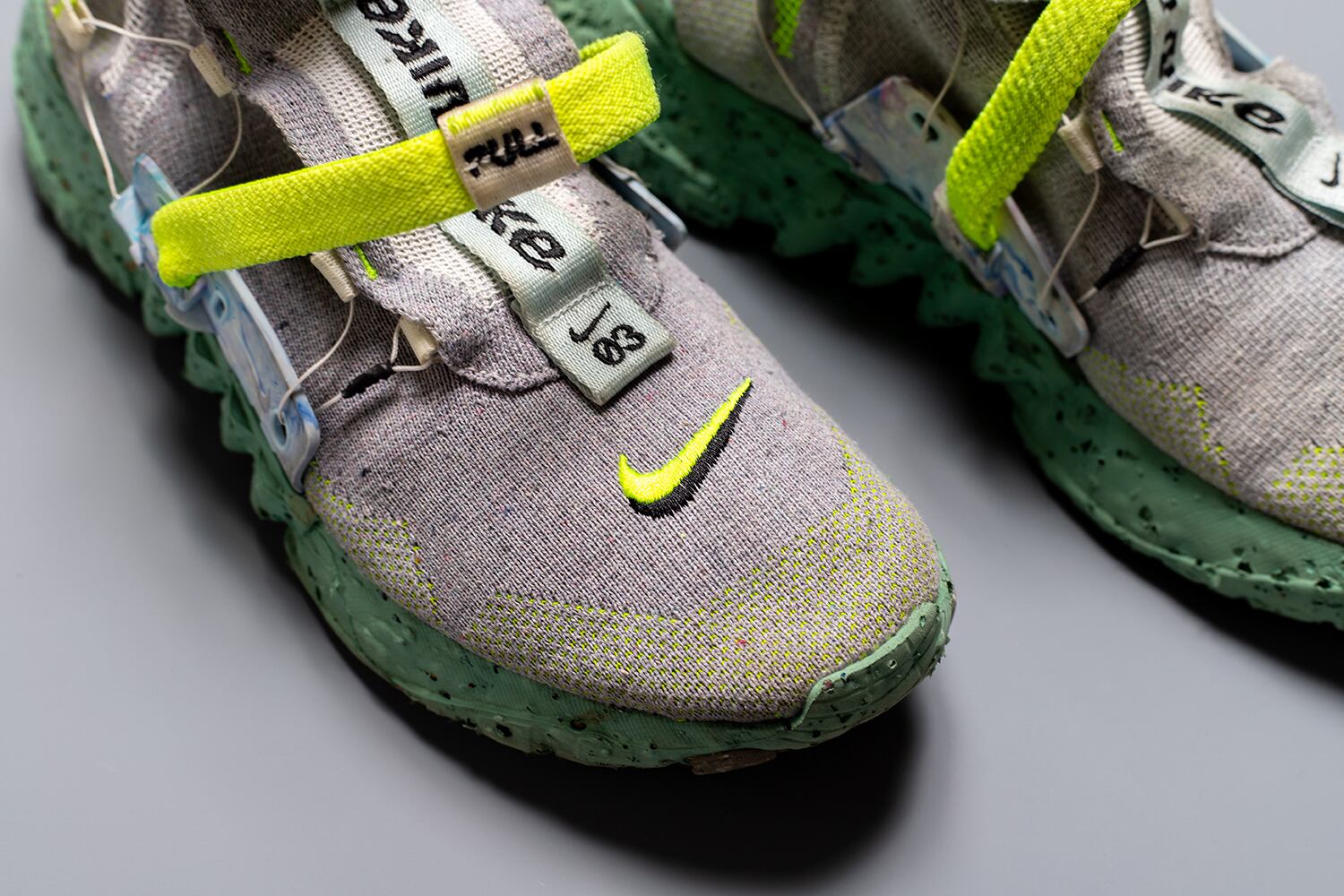 SPACE HIPPIE is an experimental footwear collection that revives discarded scraps, which for NIKE are "space trash," and creates bold designs with an emphasis on recyclability. The knit material that makes up the upper is 100% recycled, made from plastic bottles and T-shirts. The cushioning section is reprocessed from scraps of the company's NIKE VAPORFLY 4%. Carbon dioxide emissions are reduced by about half. The sole, made from crater foam, is mixed with about 15% grind rubber (rubber made from unwanted shoes or discarded materials), reducing carbon emissions while preventing the use of new materials. The 03 is a high-cut slip-on type. The futuristic design is distinctive. Lightweight and breathable, it is recommended for the season. It is equipped with a system that tightens the laces by pulling on the yellow belt in the middle of the upper. To loosen the laces, pull on the yellow belt at the rear of the shoe to release the lock and loosen the laces. Made in 2020. The shoes are made in 2020 and have a slight feeling of use. Also, the belt has stretched a bit, but it is still functional. The soles are still in good condition.