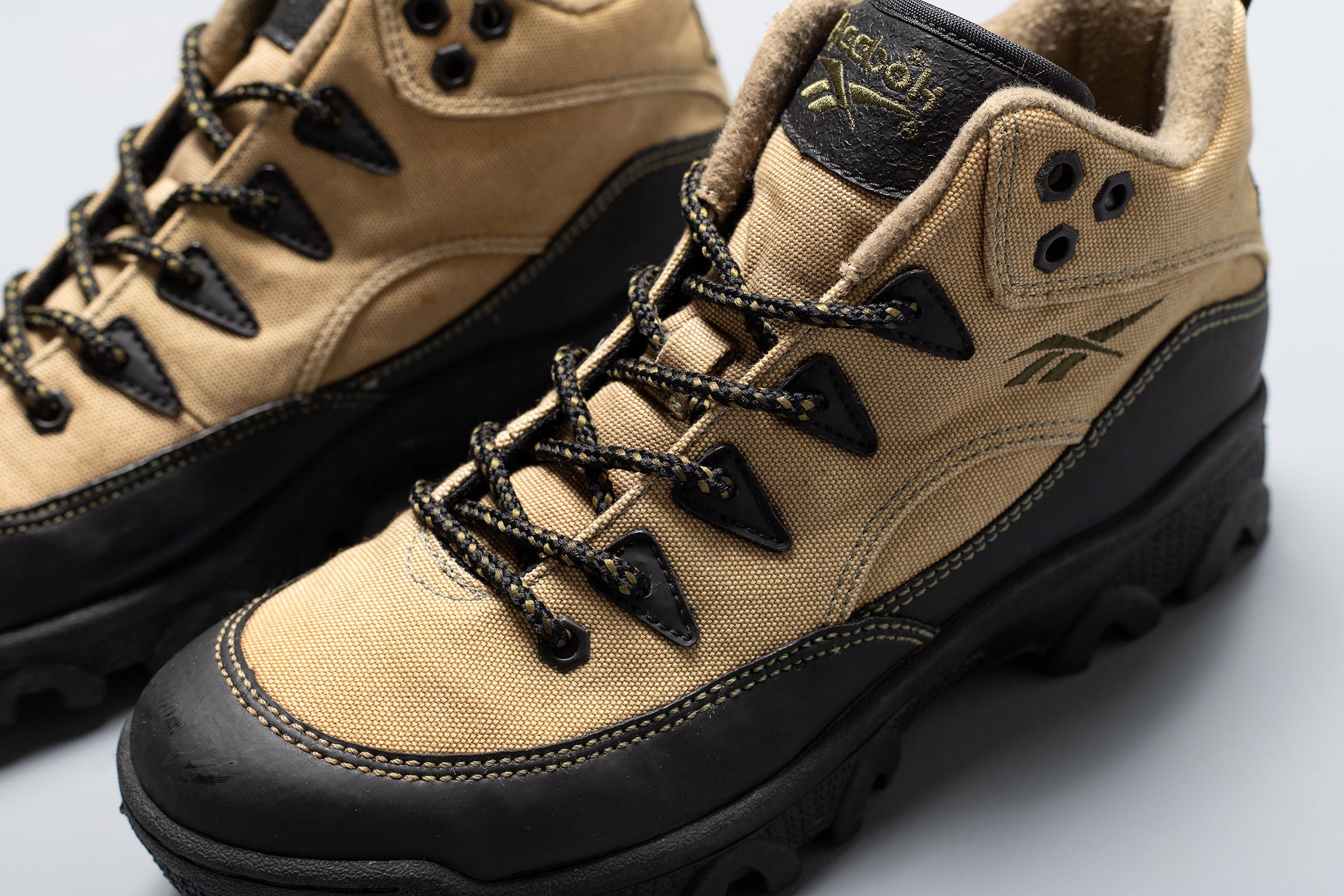 This pair of Reebok trekking shoes was introduced in 1996 and is the design source for the Reebok CLUB C GEO MID. It is a design that is hard to find in the modern Reebok. Considering their age, I think they are in pretty good condition. The soles have been re-glued.