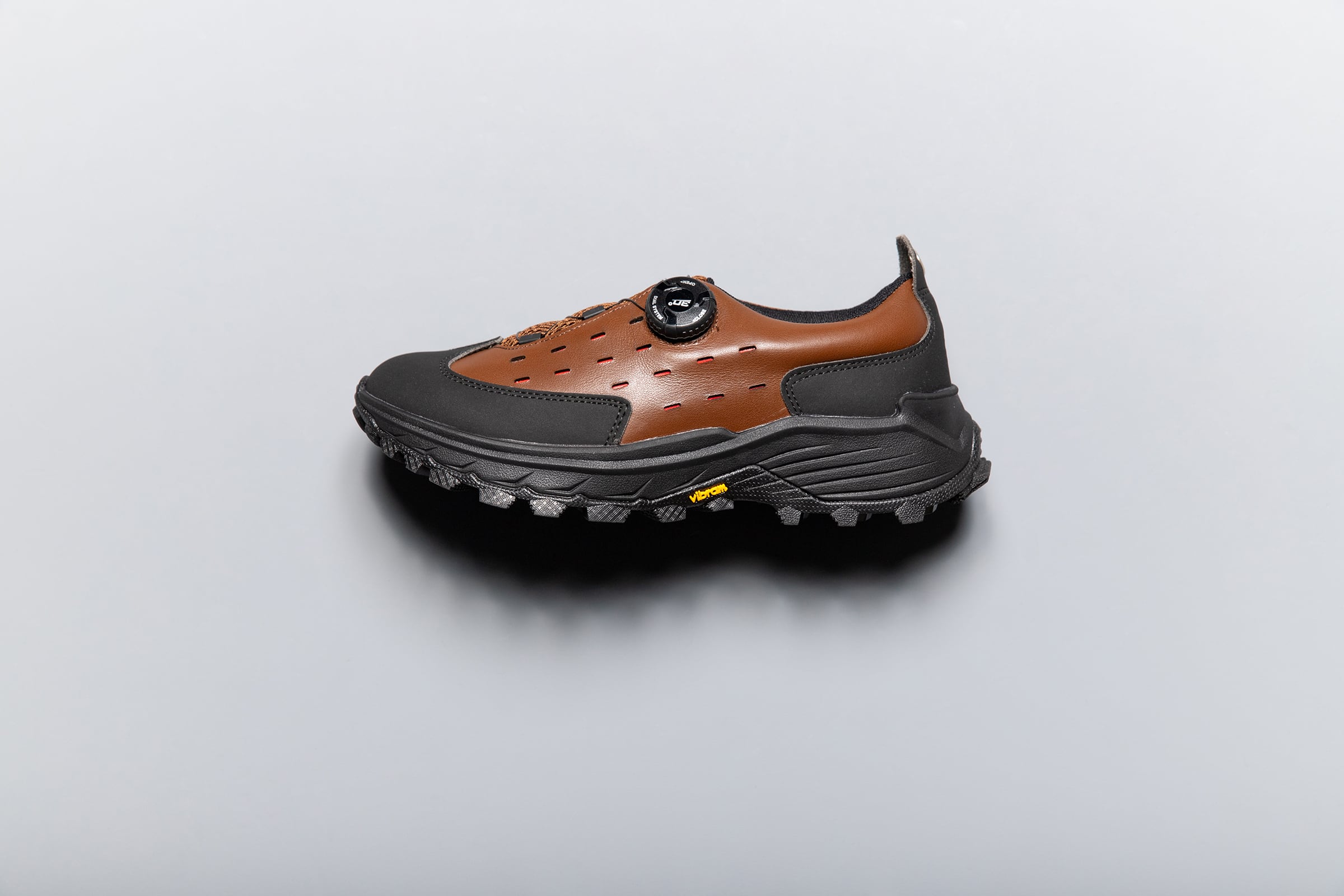 This is a PLAYGROUND exclusive SHOT. This pair is made of smooth leather (cowhide), not suede. You can enjoy the unique use of smooth leather and the good atmosphere caused by aging. The sole is also black, giving the SHOT a more massive feel than usual.The shoes are characterized by the fact that they have no tongue and are made up of two parts, the inner and outer parts, which slip under the outer part when tightened with a freelock to adjust the fitting. The design and specifications are unusual, and the shoes have a different look on the inside and outside. The sole is made of vibram traction lugs, which have a new feature attached to them. Traction lugs are functional soles with fine bumps that increase the sole's ground contact area by up to 50% when worn and loaded, thereby firmly capturing the ground and increasing the force to step forward by 25% compared to conventional soles. This is the kind of pair we want you to walk around your favorite city while experiencing the sensation of biting the earth.